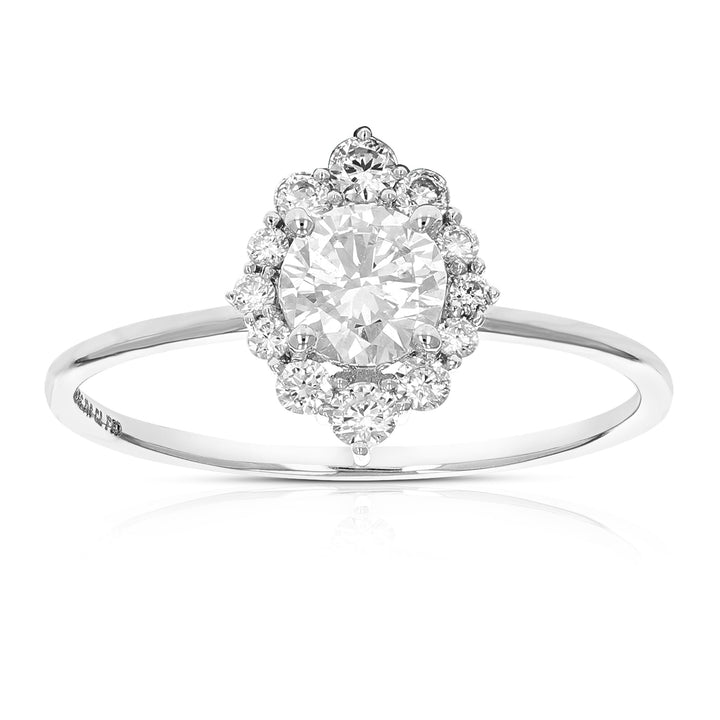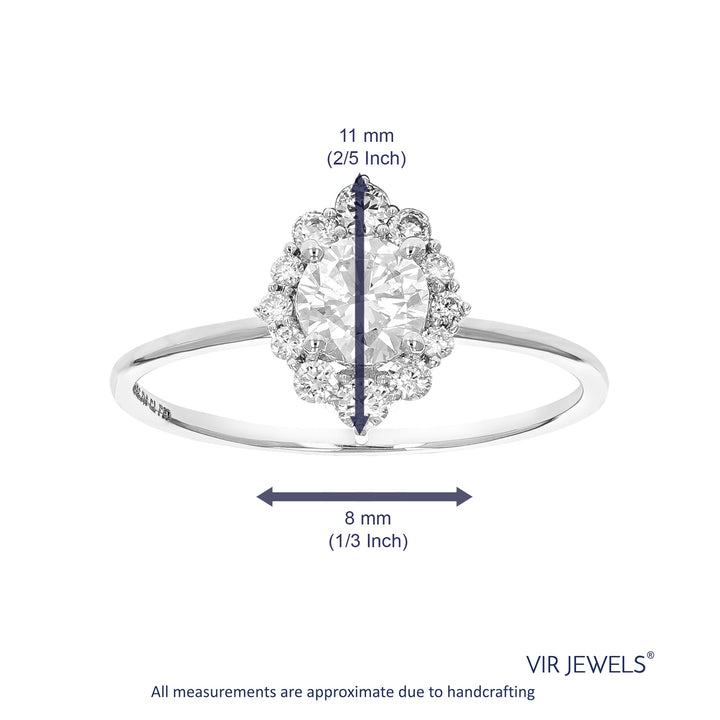 Metal: 14K White Gold, Stone: Lab Grown Diamond, Carat Weight: 3/4 cttw, Diamond Cut: Round, Diamond Color: H-I, Diamond Clarity: SI1-SI2, Setting: Prong, Number of Diamonds: 13, Engagement Ring Width: 11 mm (2/5 inch).