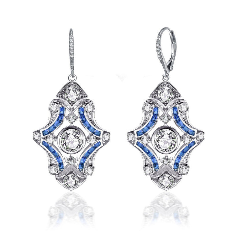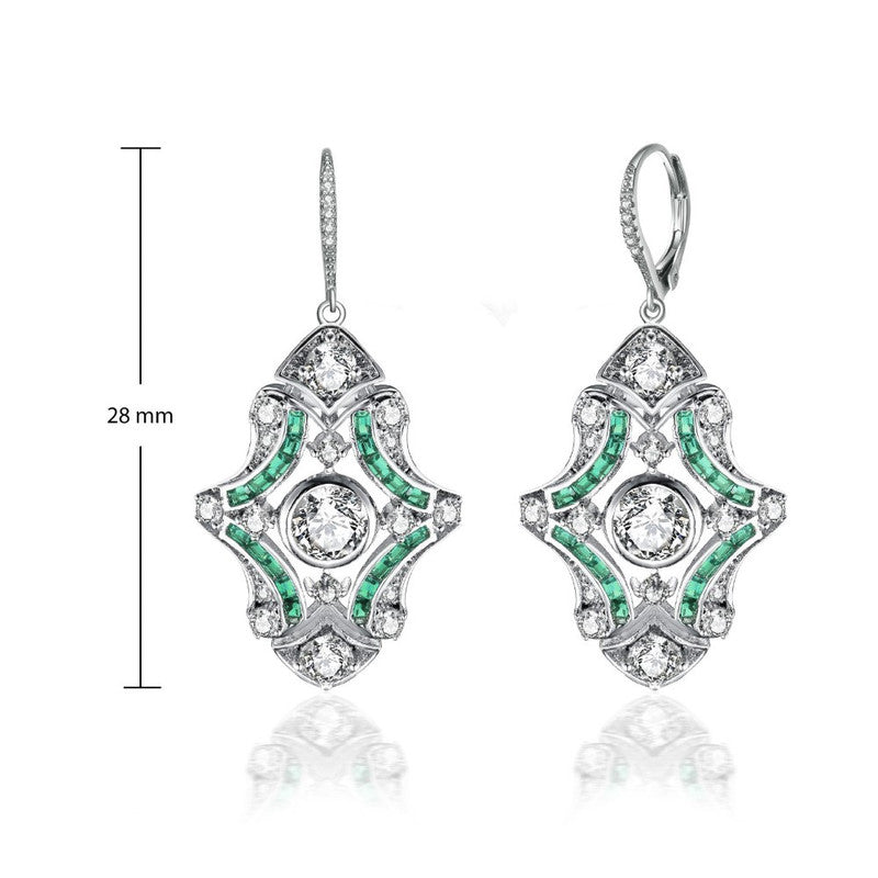 Sterling Silver White Gold Plated with Colored Cubic Zirconia Art Deco Lever Back Earrings