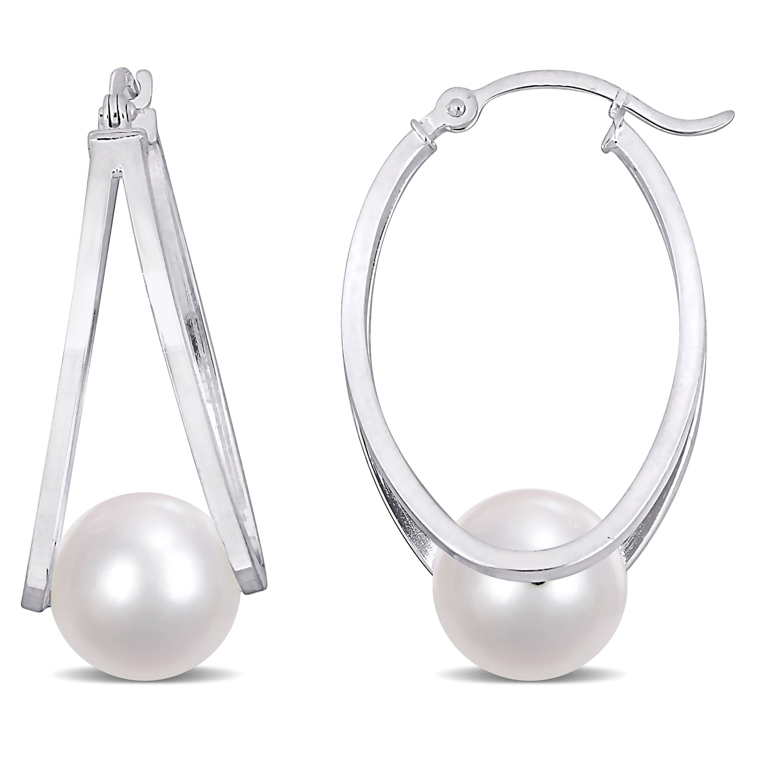 Sterling silver, 8-8.5mm freshwater cultured pearls, drop hoop design, clip-in closure.