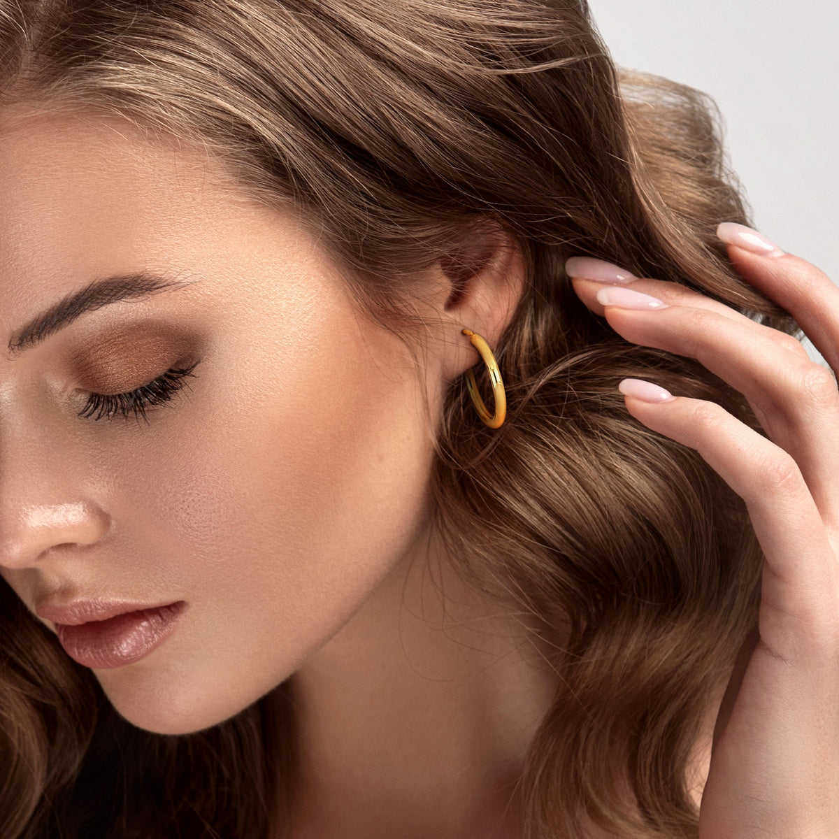 These Mimi & Max 26mm Hoop Earrings in 14k Yellow Gold are the perfect blend of elegance and versatility. The lustrous yellow gold tube hoops are enhanced with a high-polish finish, creating a sophisticated shine. The timeless design makes these earrings suitable for any occasion, from casual to formal. Their clip-in closures ensure a secure fit, allowing you to wear them comfortably all day. A must-have accessory for anyone looking to add a touch of luxury to their jewelry collection.