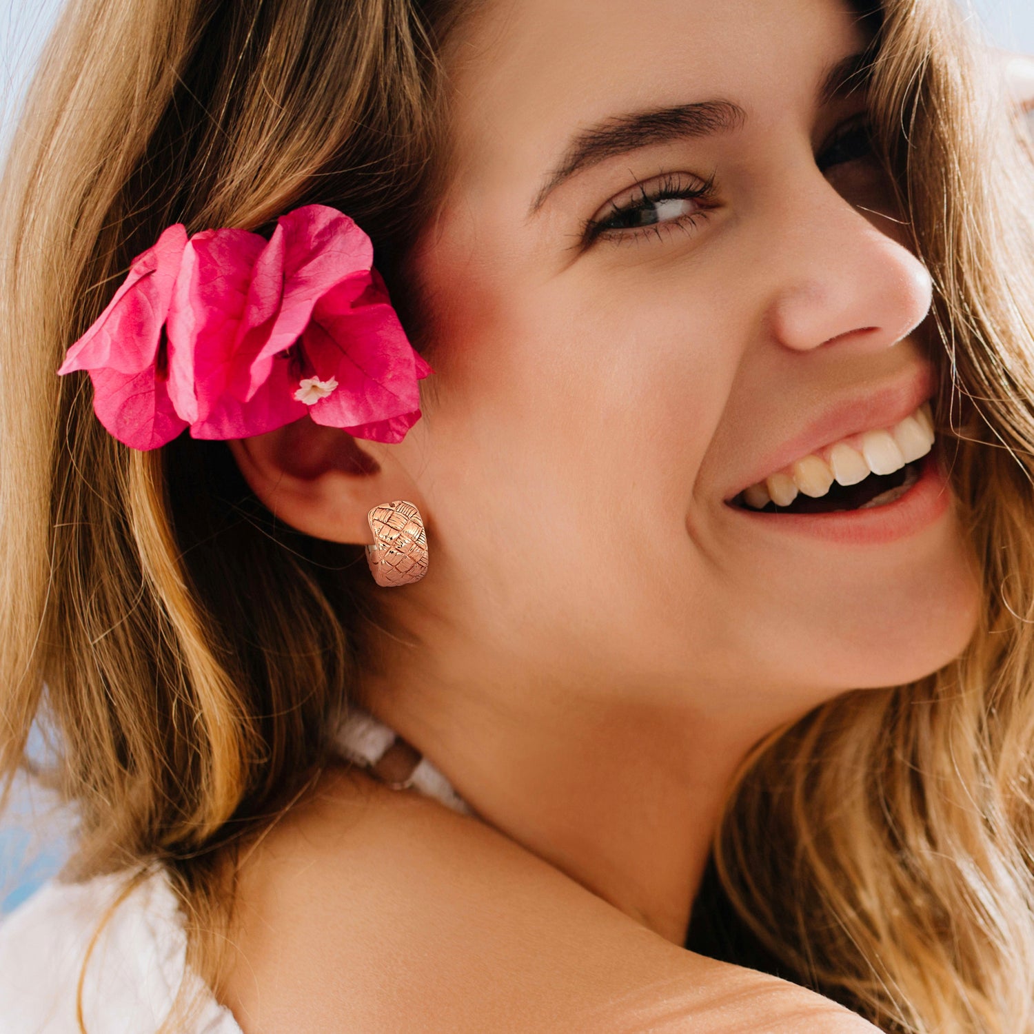 These Mimi & Max 21mm Lattice-Style Hoop Earrings in 14K Rose Gold by Mimi & Max feature a stunning lattice design that adds texture and elegance to any outfit. Crafted in lustrous rose gold, these wide hoops are designed to make a statement. They are secured with clip-in closures for comfort and durability. Whether for casual or business attire, these earrings will bring a unique charm to your look.