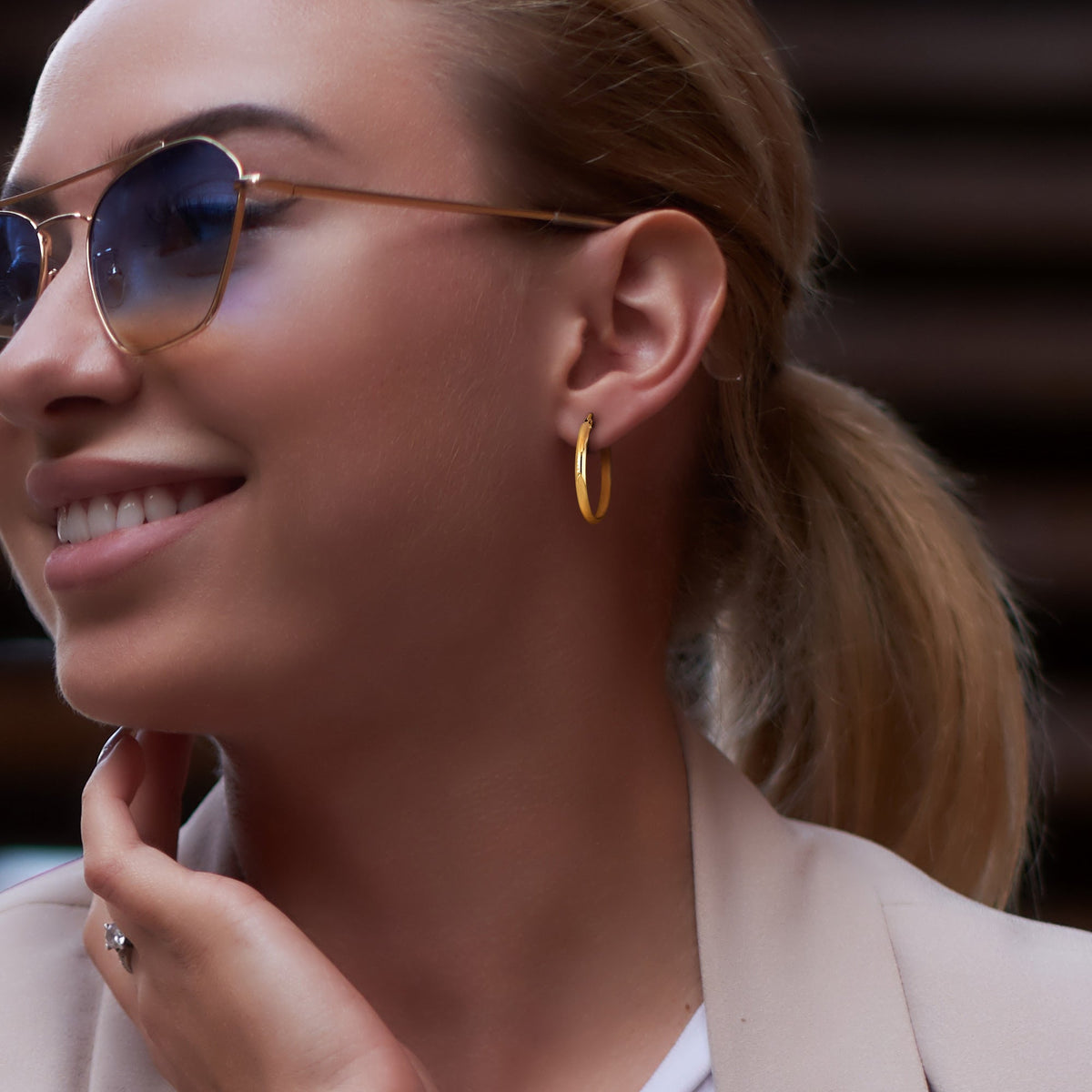 10K yellow gold, textured oval hoops, high polish finish, clip-in closures.