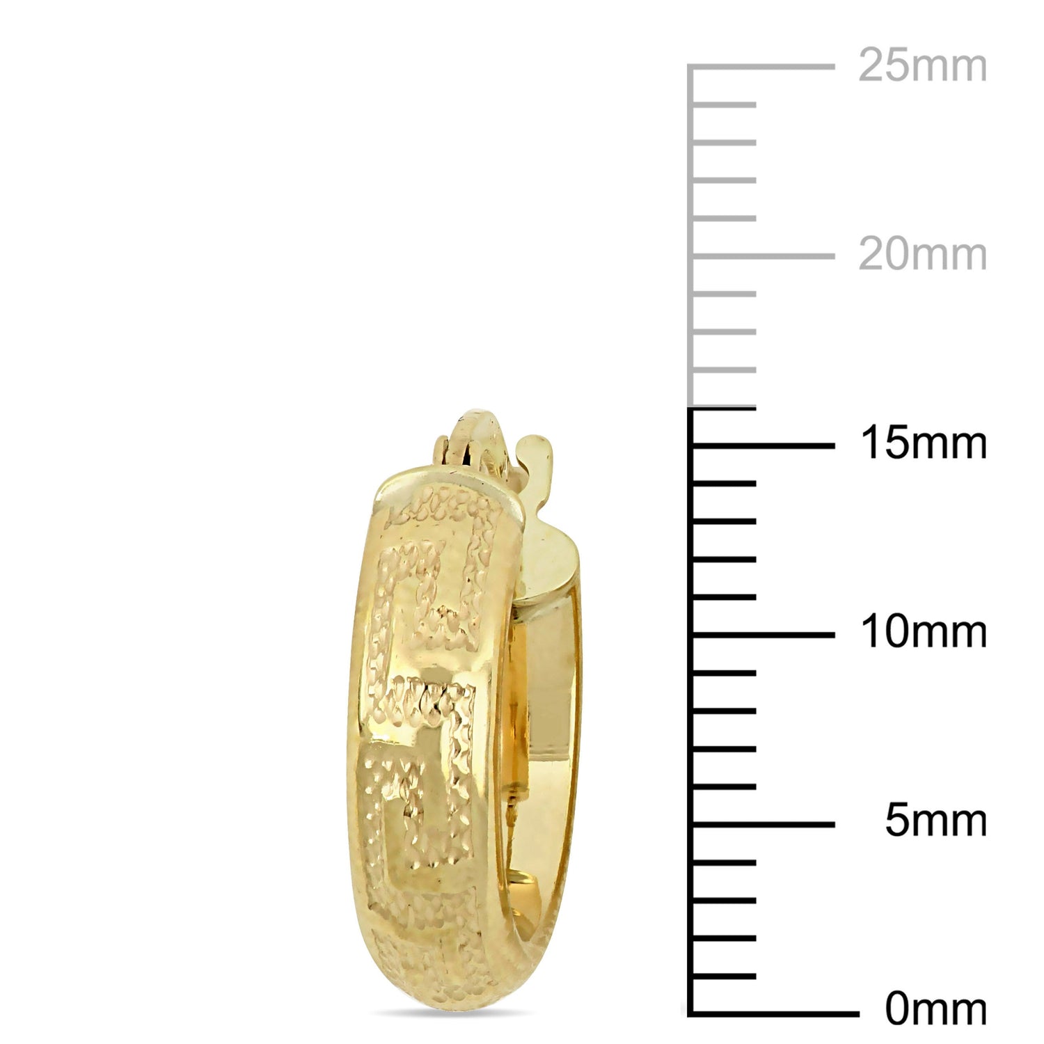 10k yellow gold. Greek key textured design. Dimensions: 15mm hoop. Clip-in closures.