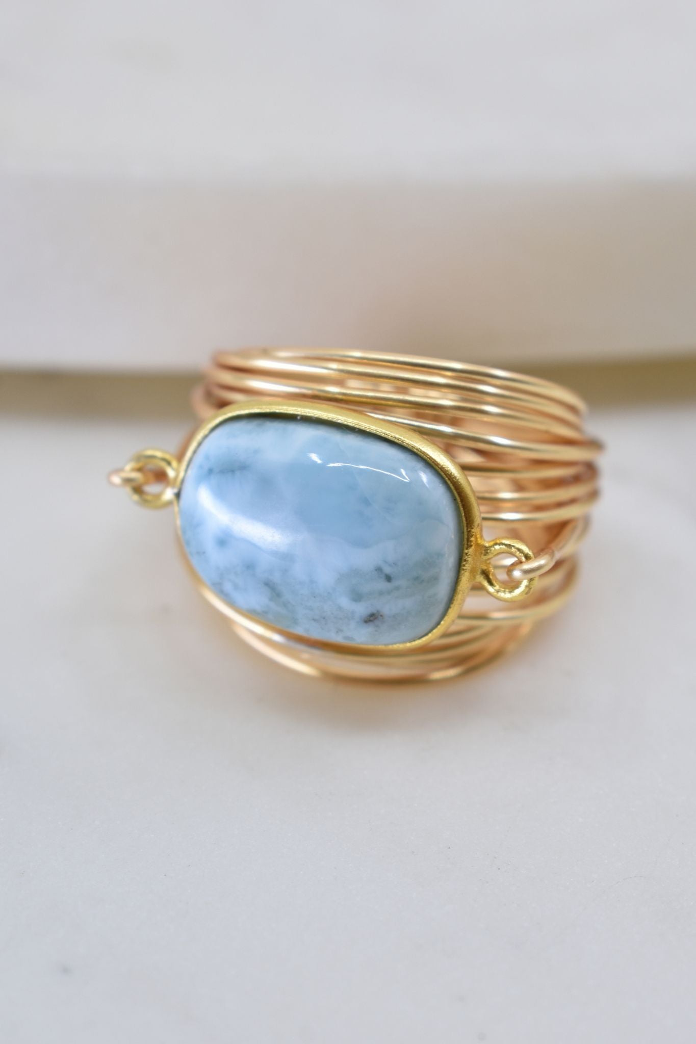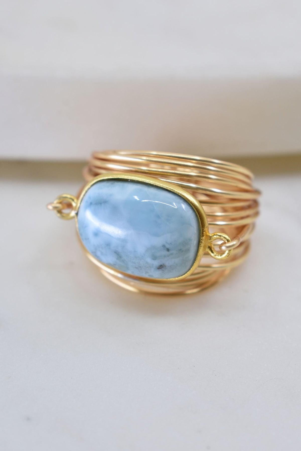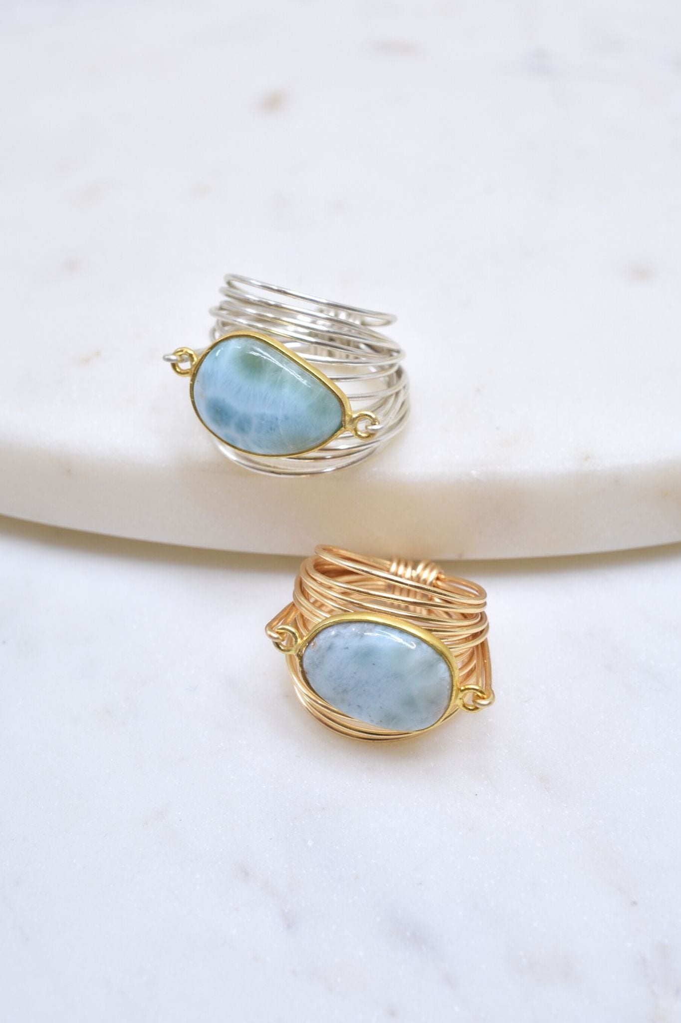 Handcrafted in 14k gold or silver over copper, featuring a bezel-set larimar gemstone. Hypoallergenic, available in sizes 4-14, including half sizes. Handmade in Sausalito, California.
