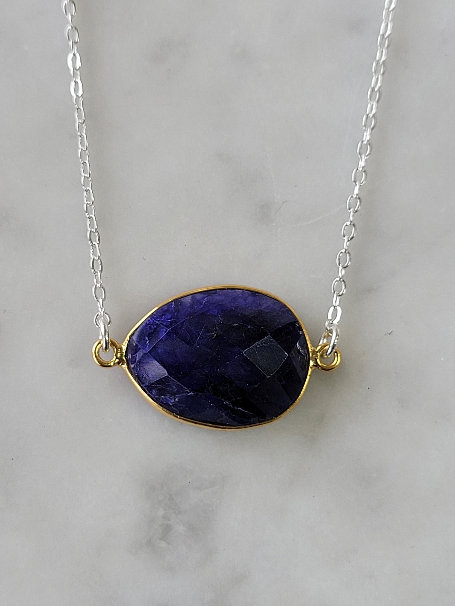 This Mrs. Parker Necklace in Sapphire by A Blonde and Her Bag is a sophisticated and elegant piece, featuring a semi-precious sapphire stone set in a 14k gold-filled bezel. This necklace, sitting on a gold or sterling silver chain, offers a timeless design that adds a touch of color and elegance to any outfit.