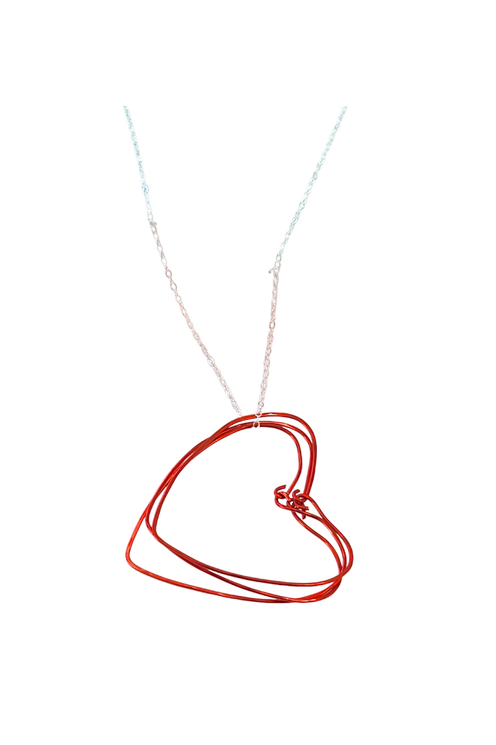 Handcrafted in metal alloy with high-quality silver plating. Features three red heart charms on a 16-inch chain with a 2-inch heart pendant. Hypoallergenic and tarnish-resistant. Handmade in Sausalito, California.