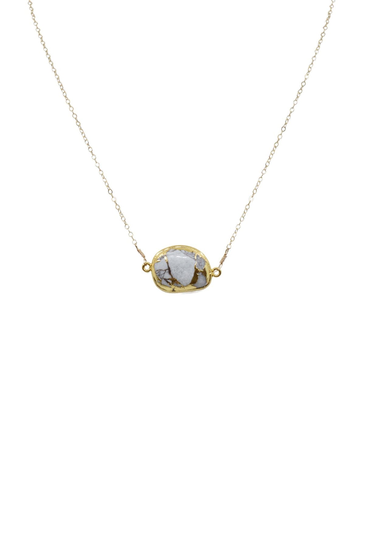 This Mrs. Parker Demi Fine Necklace in White Mojave Copper Turquoise by A Blonde and Her Bag combines the natural beauty of the white Mojave copper turquoise stone with the elegance of a 14k gold-filled bezel. Set on a simple gold-filled or sterling silver chain, this necklace is a unique piece due to the individual nature of each stone.