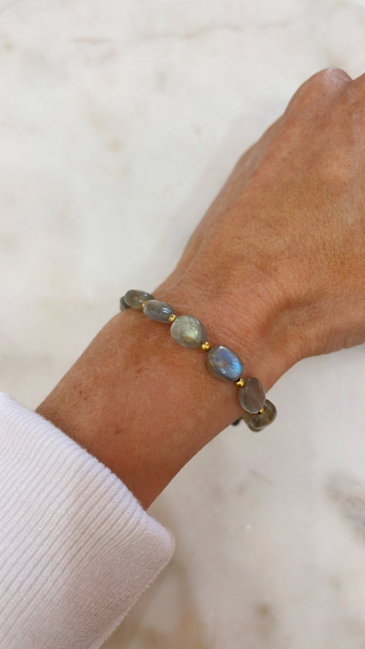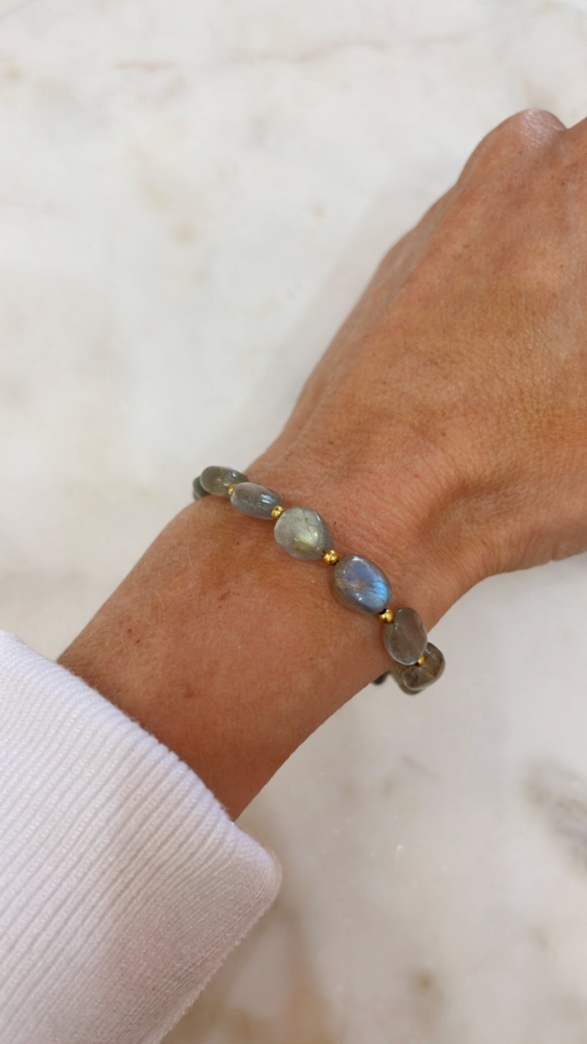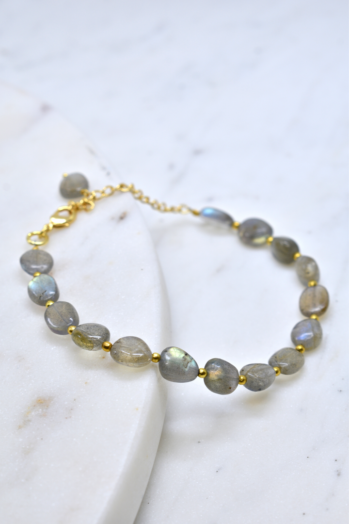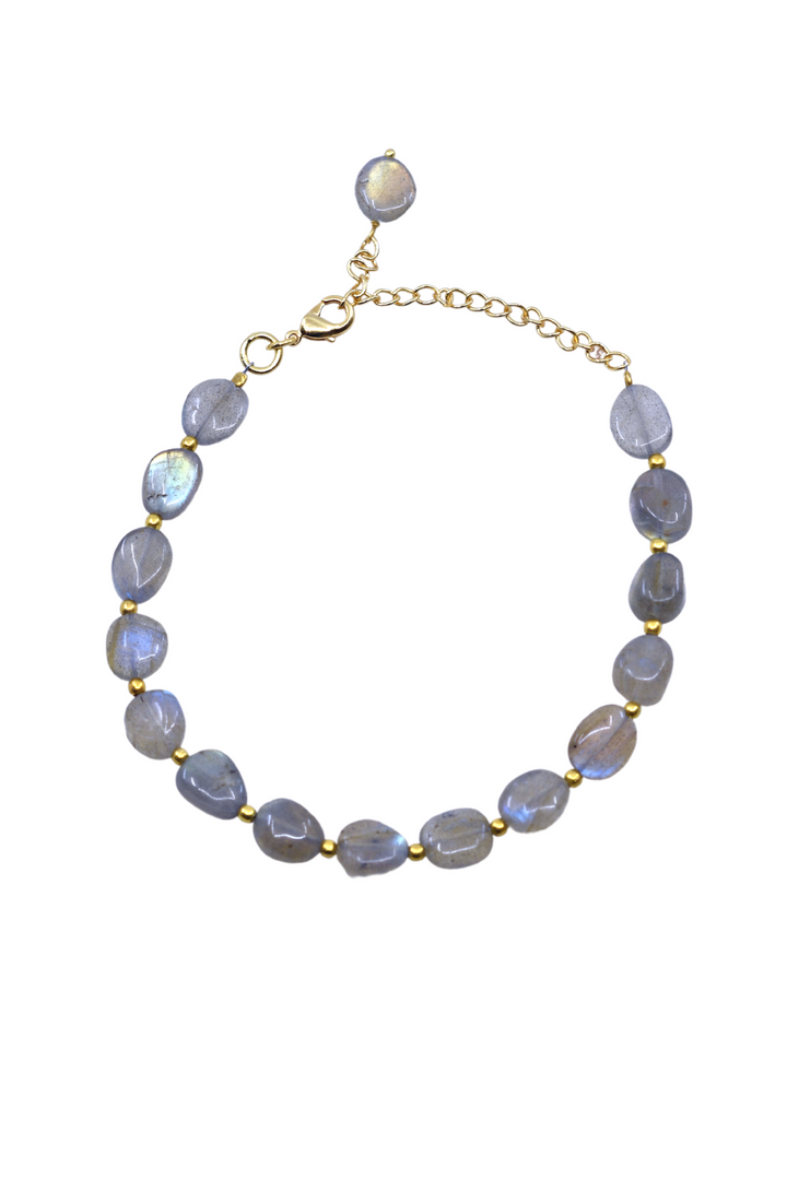 Handcrafted with labradorite stones accented by gold-toned spacer beads. Measures 6.5 inches in length with a 2-inch extender for an adjustable fit. Each stone measures 1/2 inch long by 1/4 inch wide. Hypoallergenic and made with high-quality materials for long-lasting wear. Handmade in Sausalito, California.