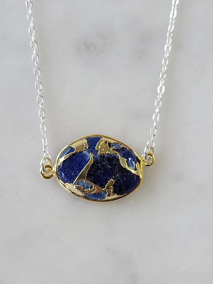 This Mrs. Parker Necklace in Green Mojave Copper Turquoise by A Blonde and Her Bag is another beautiful rendition of the Mrs. Parker design, featuring a semi-precious green Mojave copper turquoise stone set in a 14k gold-fill bezel. Suspended on a gold or silver-colored brass chain, this necklace exudes natural elegance. Each stone is unique, adding a personalized touch to each piece.