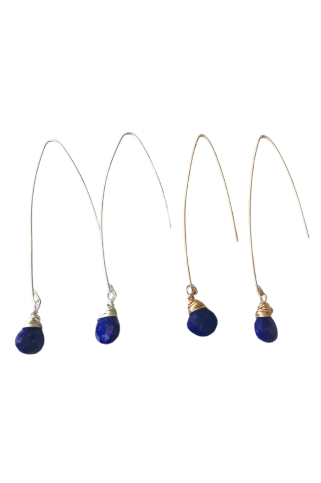 14k gold-fill or sterling silver. Natural sapphire stone. Hypoallergenic. Handmade in Sausalito, California. Length: 1.5 inches.