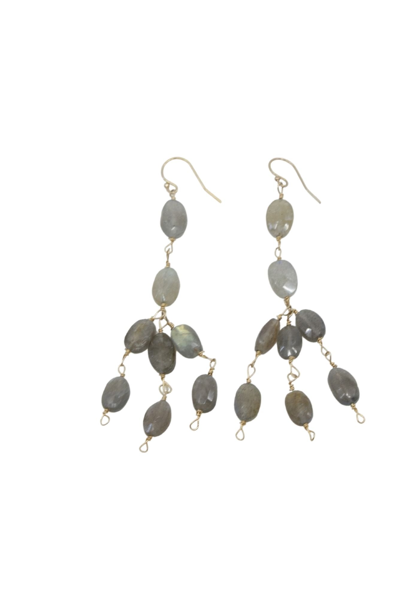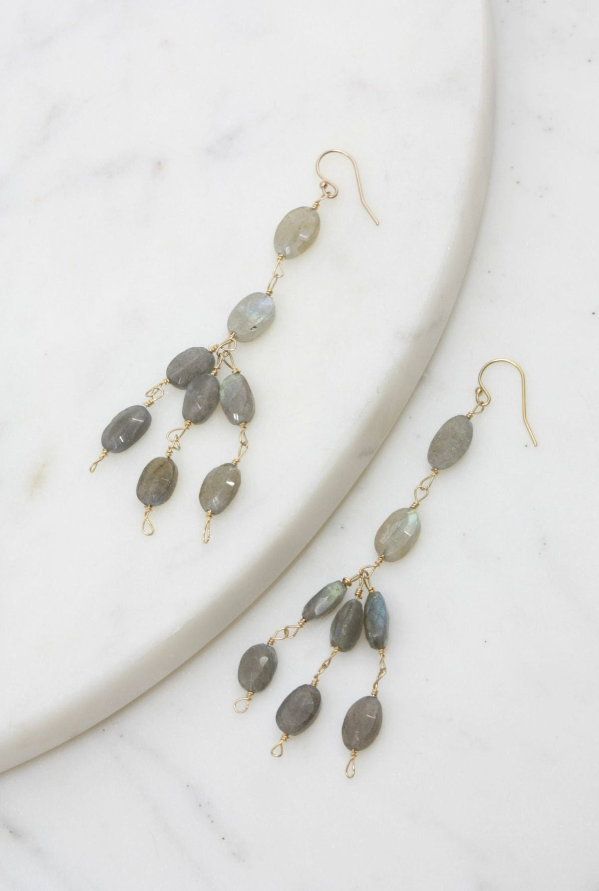 Handcrafted with 9 labradorite gemstones set in a three-tier drop design. Measures 3 inches in length. Hypoallergenic and made with high-quality plated metal alloy (silver, copper, and other metals) for lasting wear. Handmade in Sausalito, California.