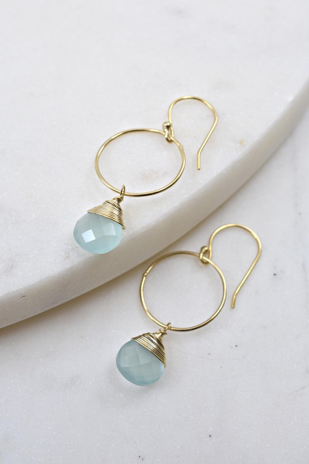 The Yuliya Earrings in Chalcedony by A Blonde and Her Bag offer a timeless elegance, showcasing a gracefully hand-wrapped chalcedony stone suspended from a gold vermeil hoop. Inspired by European aesthetics, these earrings embody delicate sophistication, perfect for day-to-night wear.
