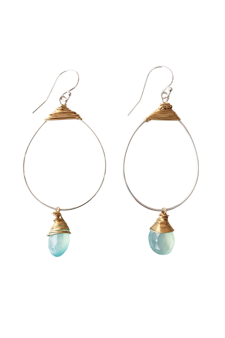 Handcrafted with a sterling silver hoop wrapped in 14k gold fill wire, featuring a chalcedony stone drop. Measures 2 inches (45mm) in diameter. Hypoallergenic and made with high-quality plating for long-lasting wear. Handmade in Sausalito, California.
