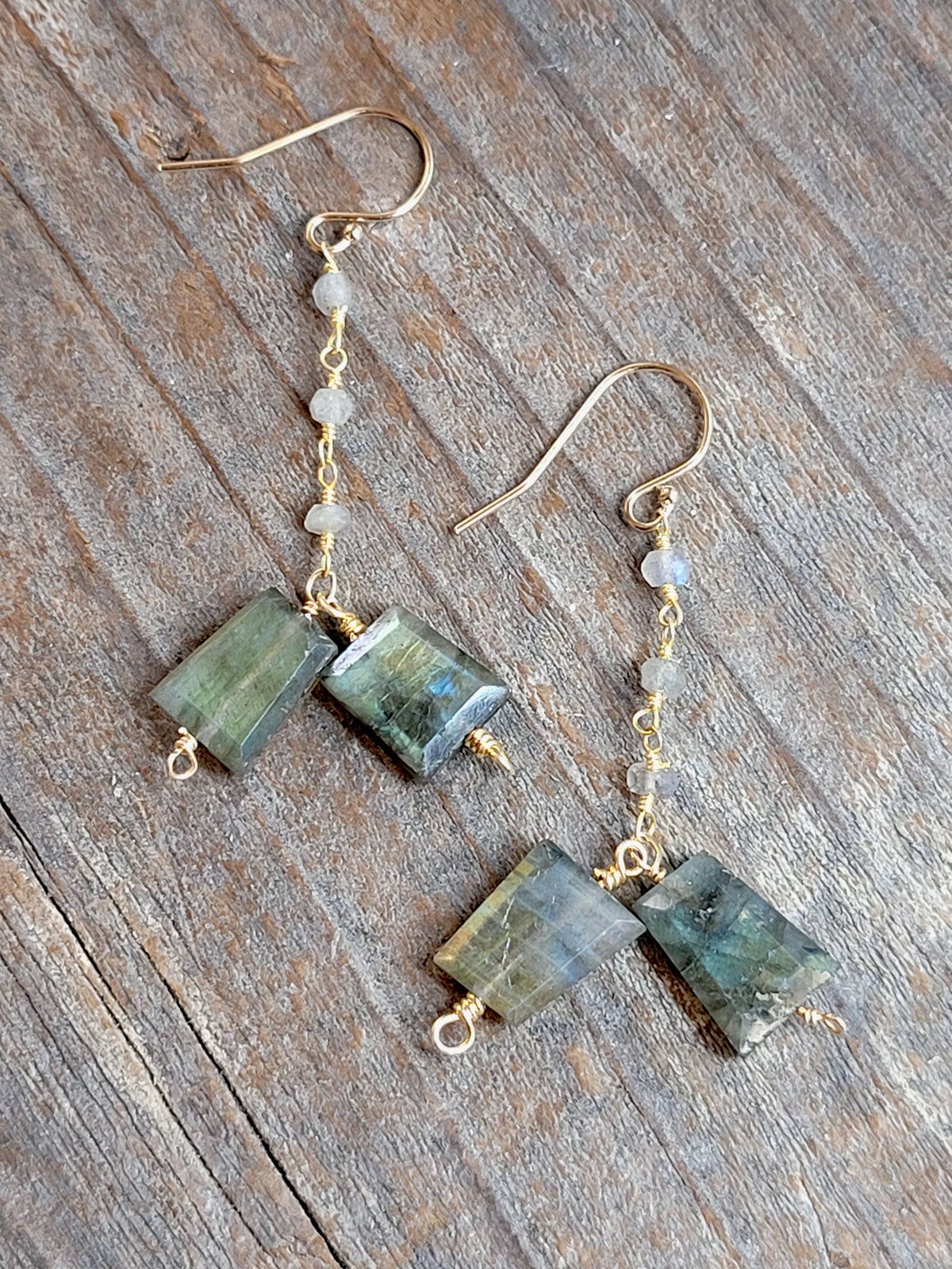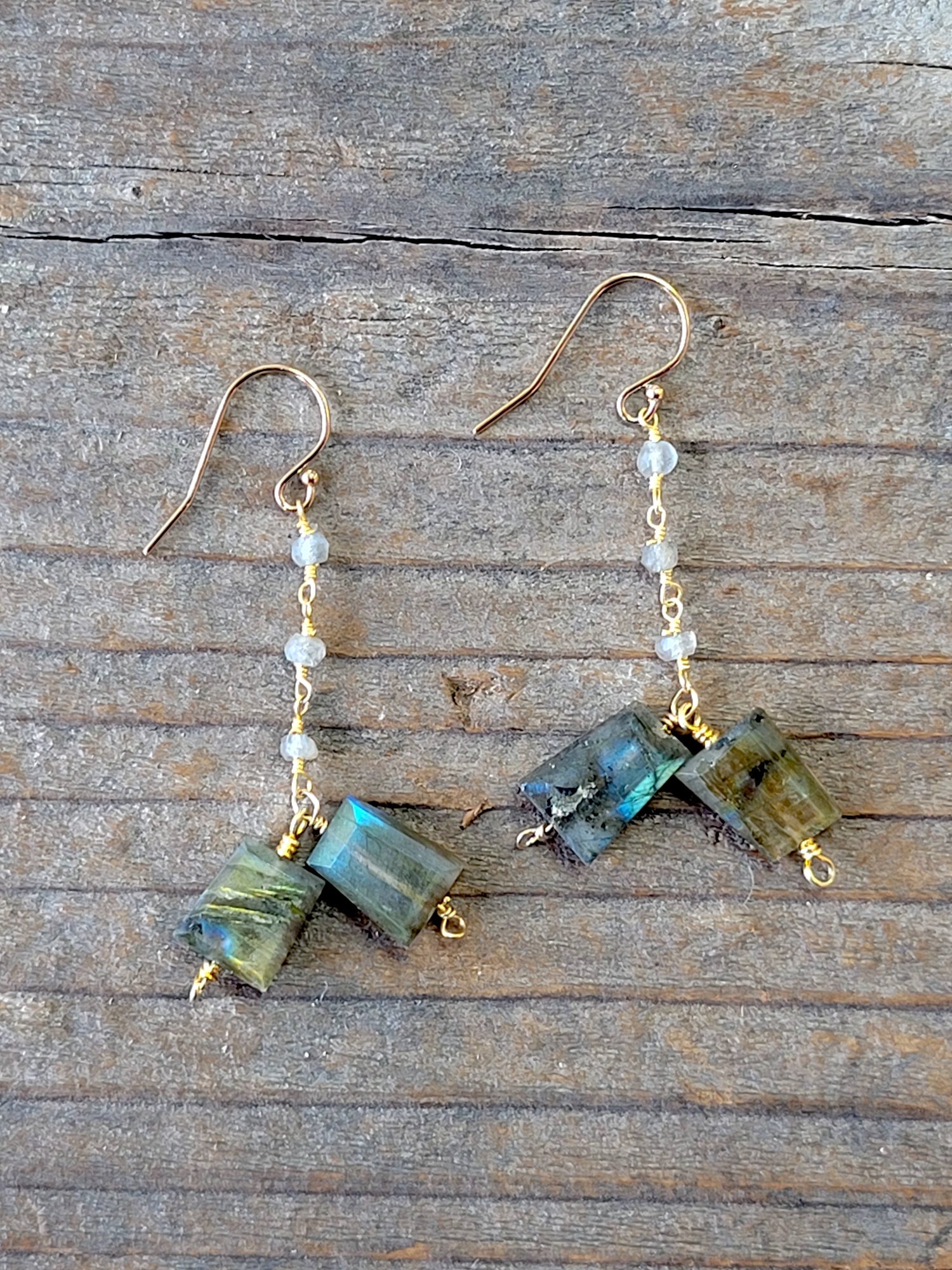 Gold-tone metal alloy, labradorite beads. Earring length: 2', width: 1/4'. Hypoallergenic. Handmade in Sausalito, California.