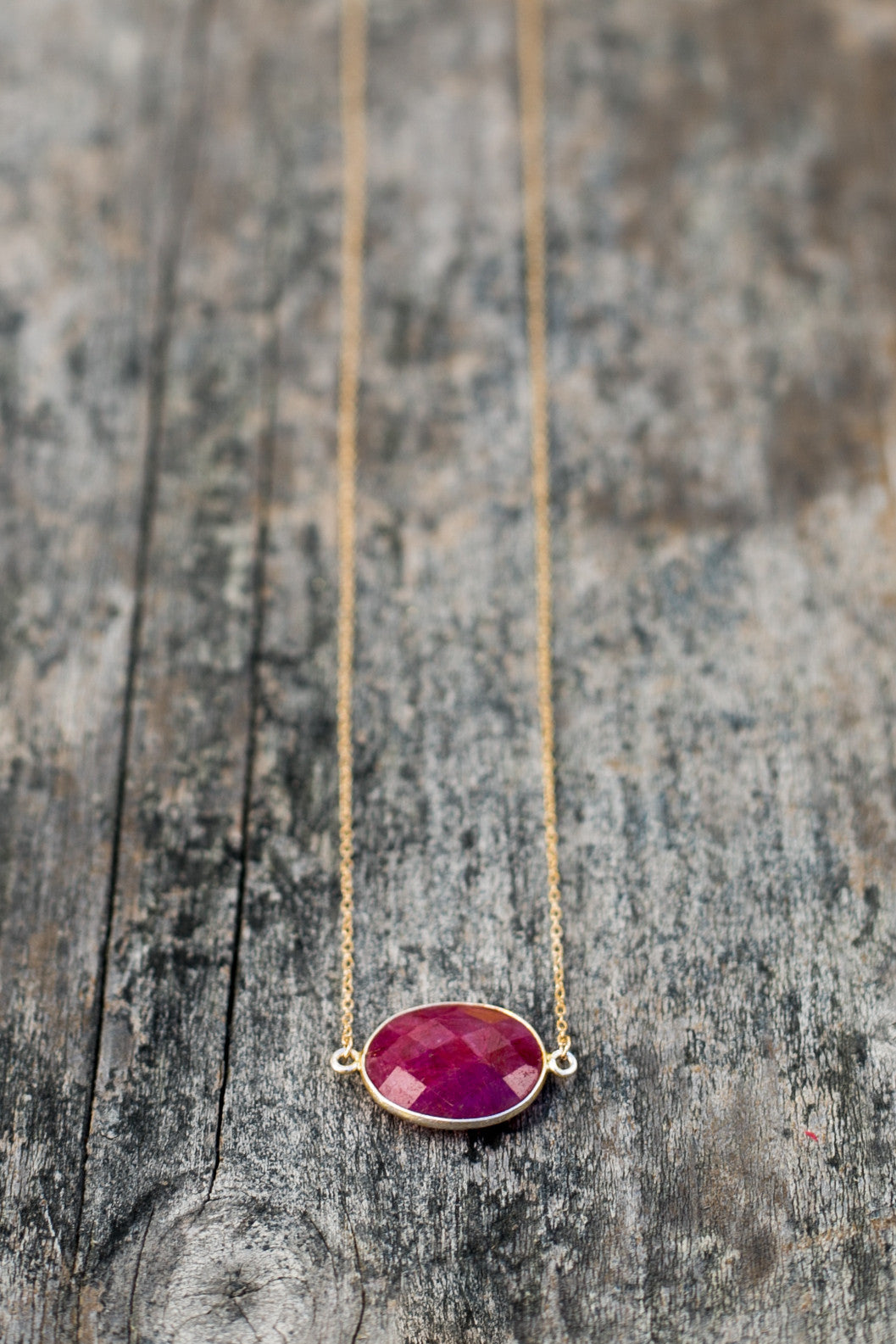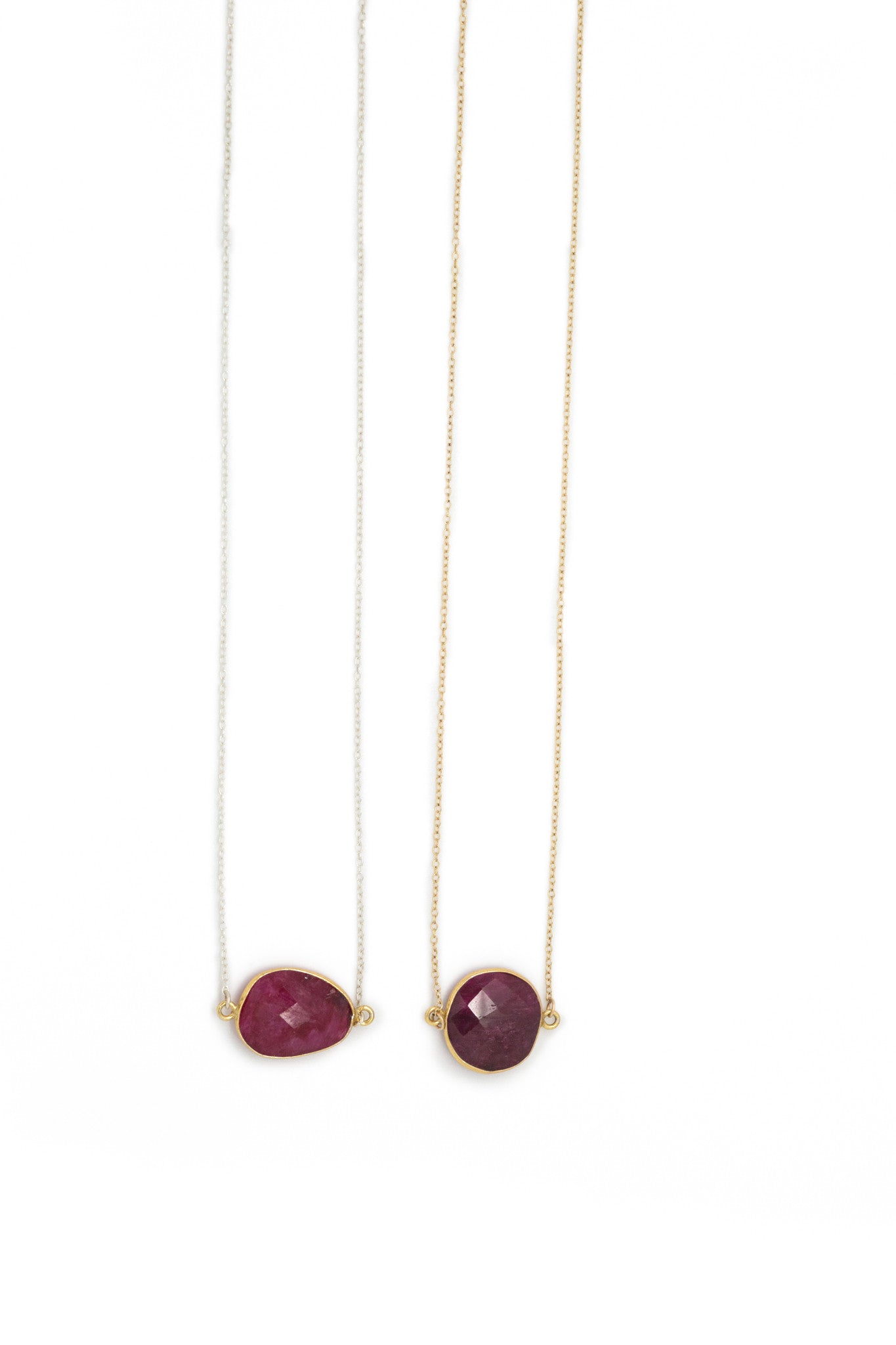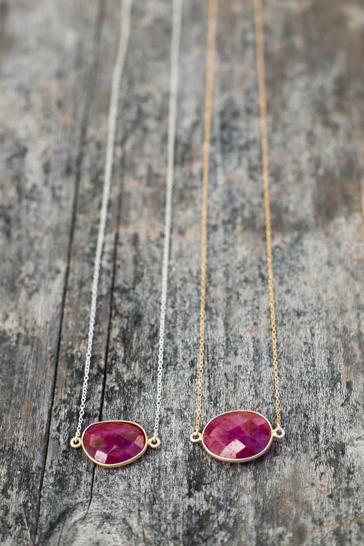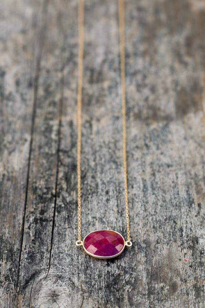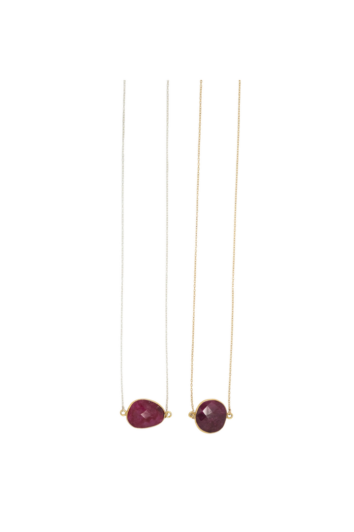 Semi-precious ruby set in 14k gold vermeil bezel. Available on a 14k gold fill or sterling silver chain. Length: 16'. Handmade in Sausalito, California.