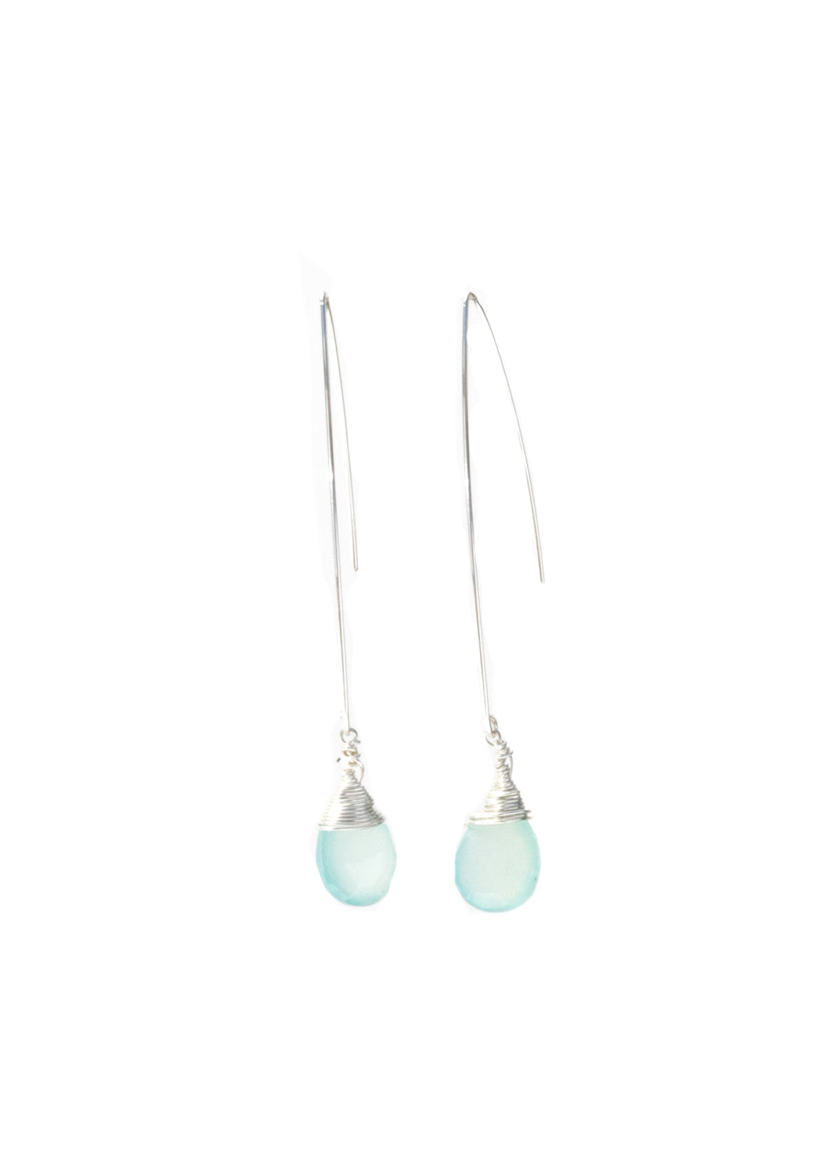 These Jill Long Wire Drop Earrings in Chalcedony by A Blonde and Her Bag feature chalcedony stone drops, hand-wrapped in your choice of 14k gold fill or sterling silver. These elegant earrings are perfect for both casual and formal occasions, adding a touch of sophistication.
