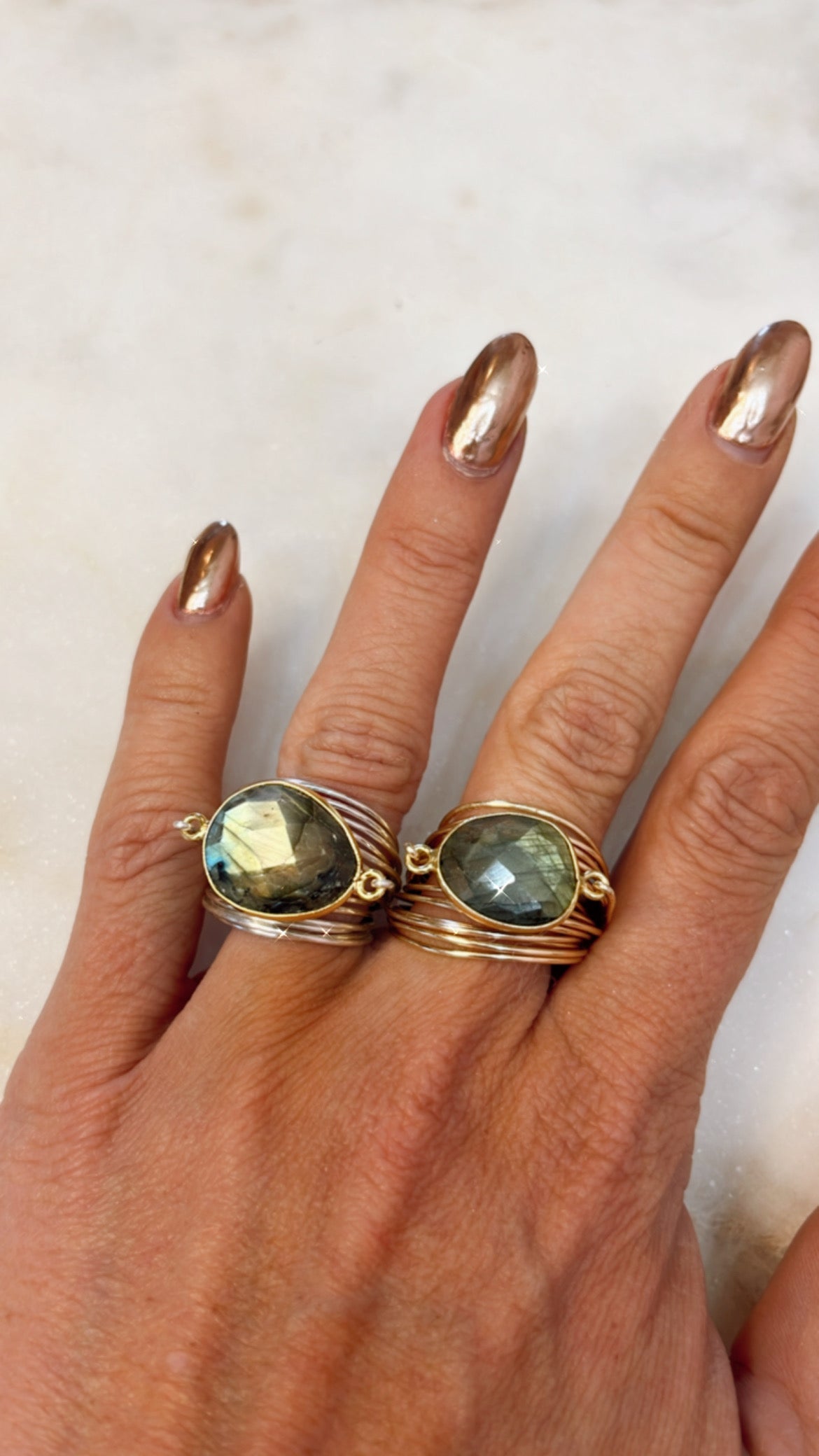 Semi-precious labradorite set in a 14k gold bezel. Available on various wire choices. Hypoallergenic. Handmade in Sausalito, California. Available in sizes 4–14, including half sizes.