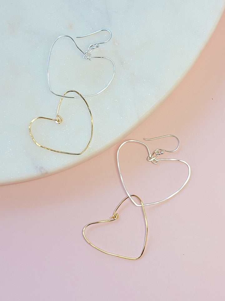 Crafted from a high-quality metal alloy (silver, copper, and other metals) with a durable plating for long-lasting wear. Features a 3 1/4-inch drop length with a hammered gold heart and polished silver heart design. Hypoallergenic and handmade in Sausalito, California.