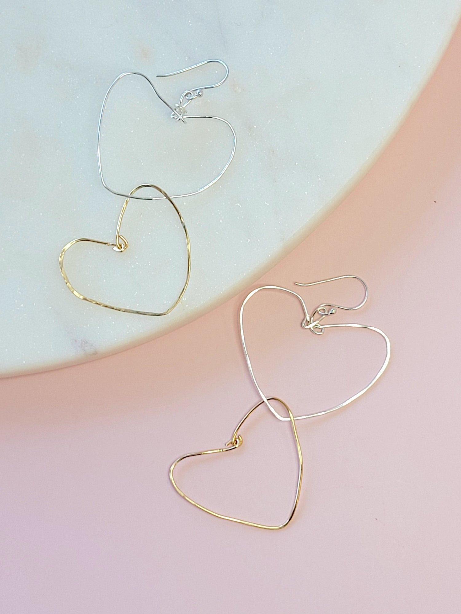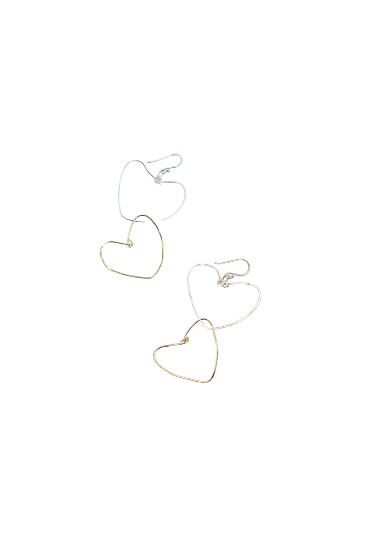 The Two Heart Hammered Gold Polished Silver Earrings by A Blonde and Her Bag offer a charming mix of textures and metals, creating a visually striking contrast. These double-heart drop earrings feature a hammered gold heart paired with a polished silver heart, symbolizing unity and elegance. With their elongated silhouette and mixed-metal shine, these earrings make a sophisticated statement, perfect for both everyday wear and special occasions.