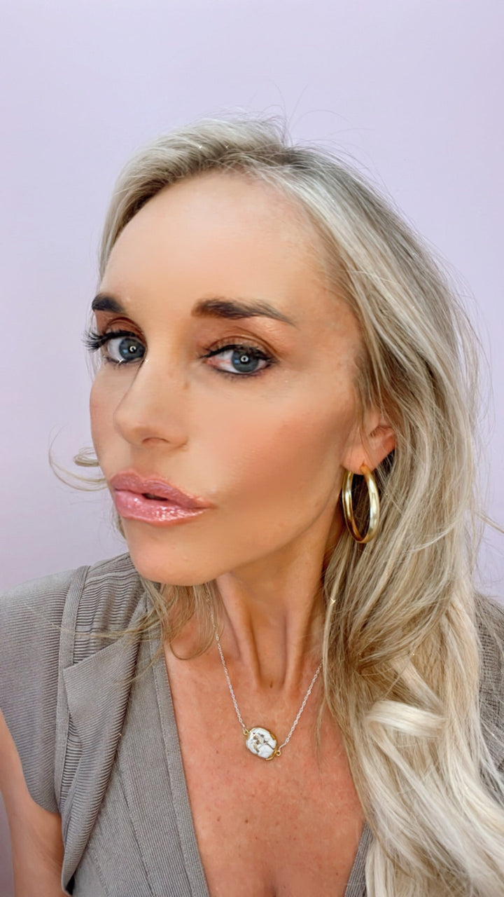 This Mrs. Parker Necklace in White Mojave Copper Turquoise by A Blonde and Her Bag is a stunning and simple design that features a semi-precious white Mojave copper turquoise stone set in a 14k gold-filled bezel. The turquoise, with its unique white and copper veins, adds a touch of earthy elegance to this chic necklace. It sits gracefully on a gold or silver-colored chain and is perfect for everyday wear or for adding a bohemian flair to your look.