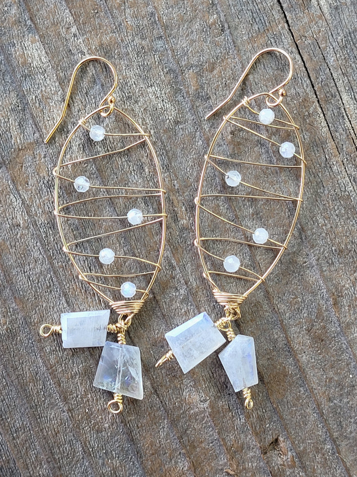 Handcrafted in a high-quality metal alloy, featuring moonstone accent stones. Measures 2.5 inches in length, 0.75 inches in width. Hypoallergenic and made with high-quality plating for long-lasting wear. Handmade in Sausalito, California.