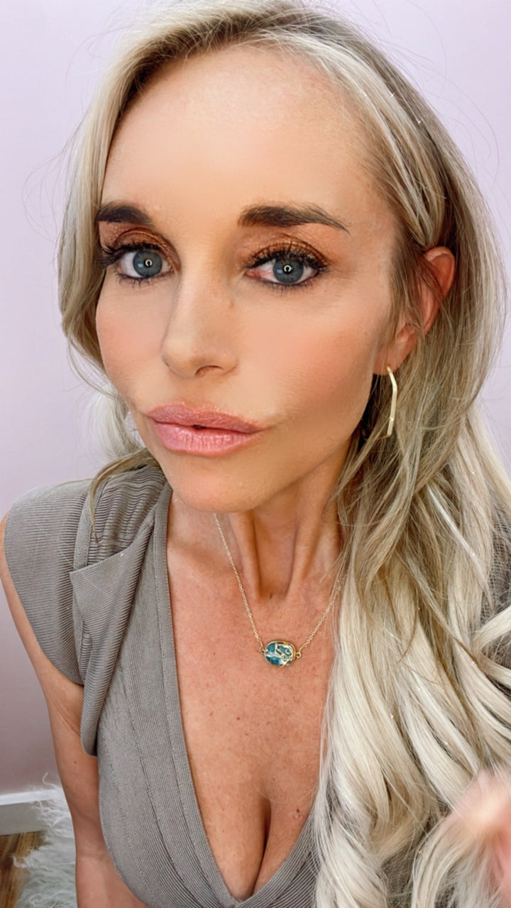 This Mrs. Parker Necklace in Teal Mojave Copper Turquoise by A Blonde and Her Bag features a semi-precious teal Mojave copper turquoise stone, set in a 14k gold-filled bezel. The combination of teal and copper tones in the stone brings an earthy richness to the design, while the gold or silver-colored chain adds a modern touch. The necklace is a perfect balance of boho chic and refined elegance, making it a versatile piece for various occasions.