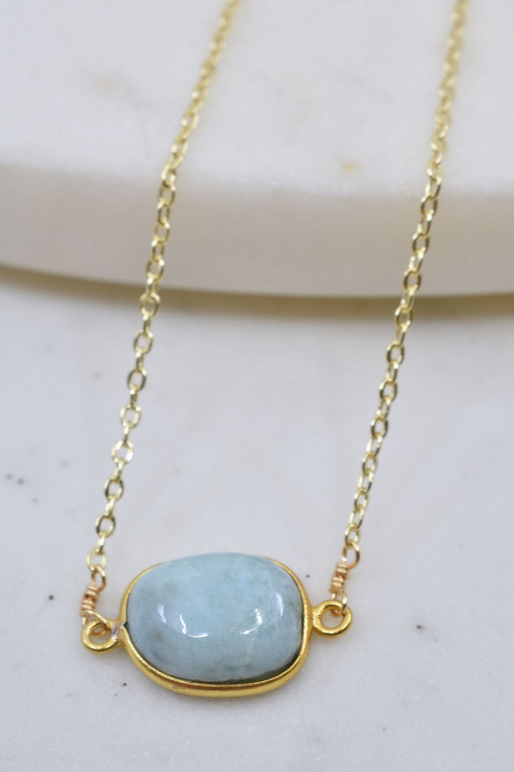 Semi-precious Larimar stone (3-3.5mm). Set in 14k gold-filled bezel. Necklace length: 16 inches with 3-3.5mm stone chain. Handmade in Sausalito, California.