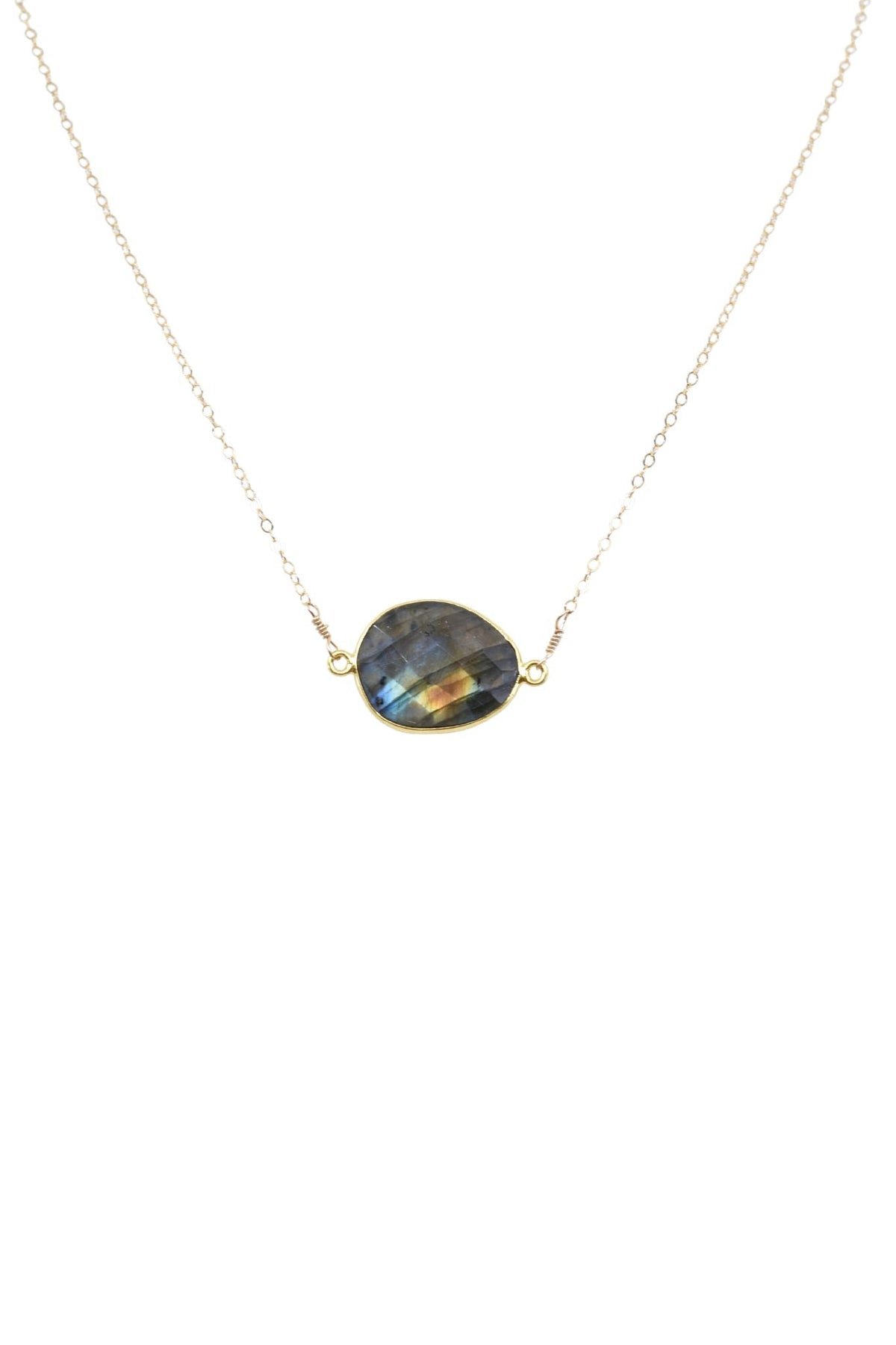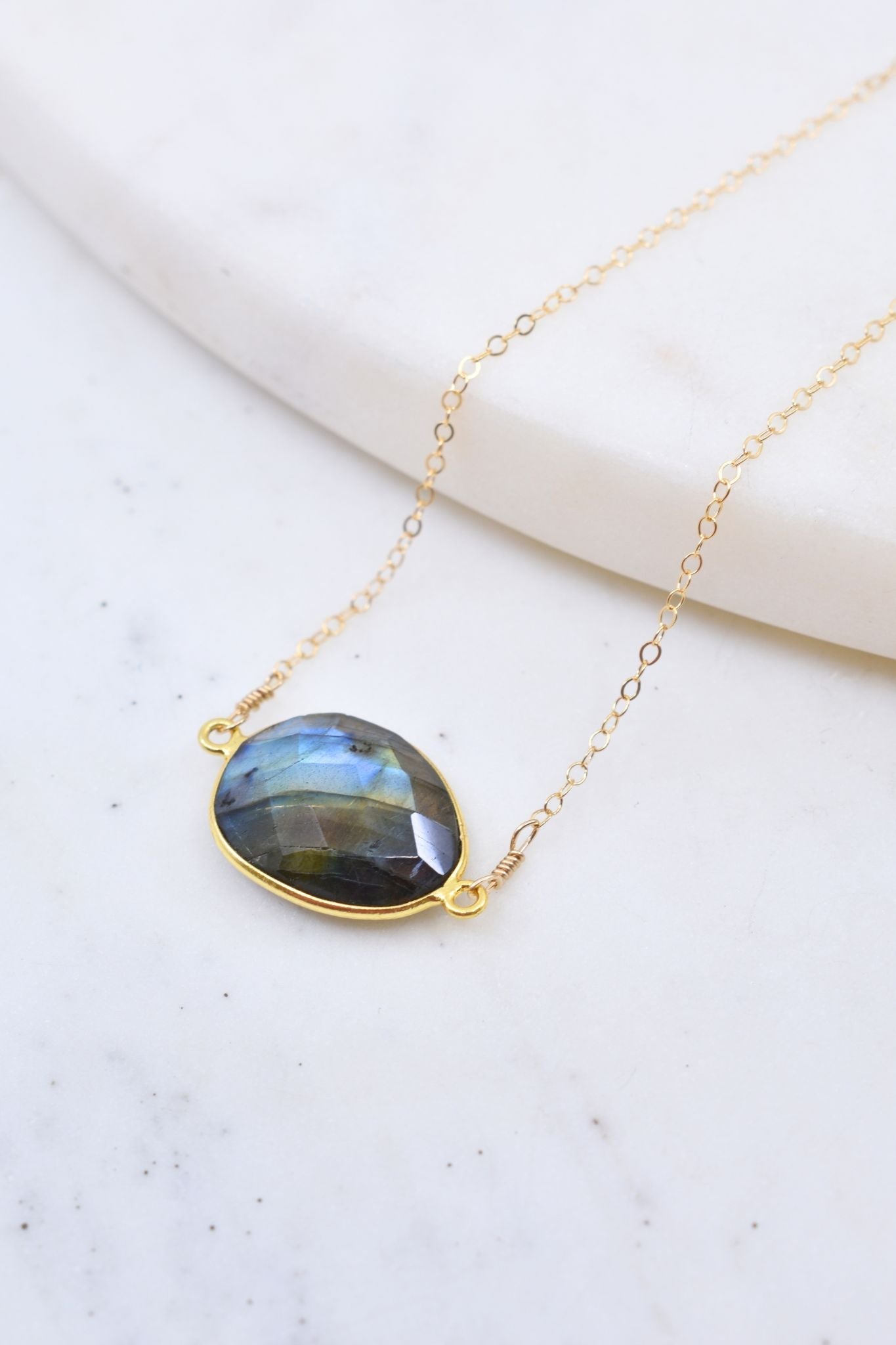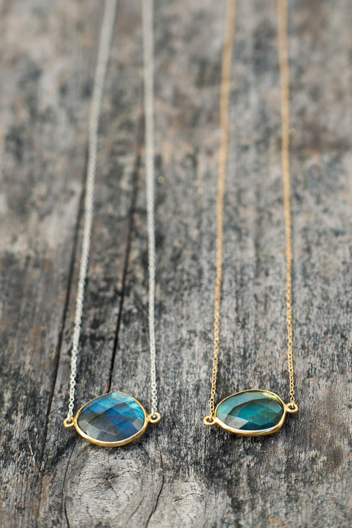 Semi-precious labradorite stone. Set in 14k gold vermeil bezel. Sterling silver chain (16' length). Handmade in Sausalito, California.