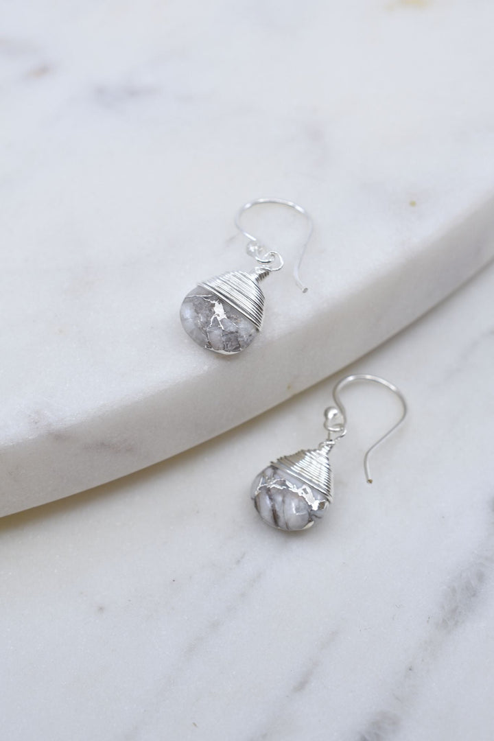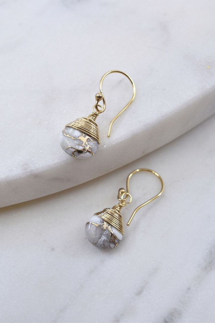 Made with white Mojave copper turquoise, hand-wrapped in vermeil or sterling silver. Earring length: 1 inch. Handmade in Sausalito, California.