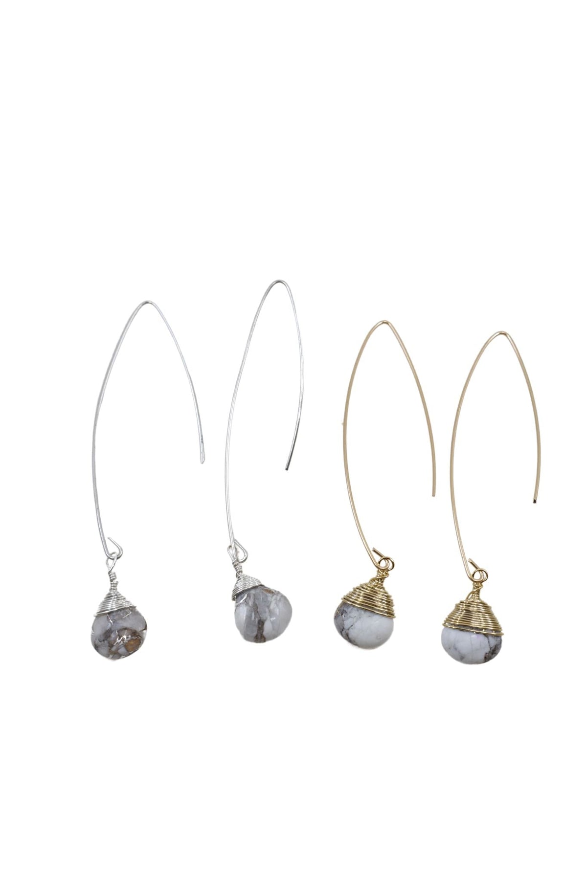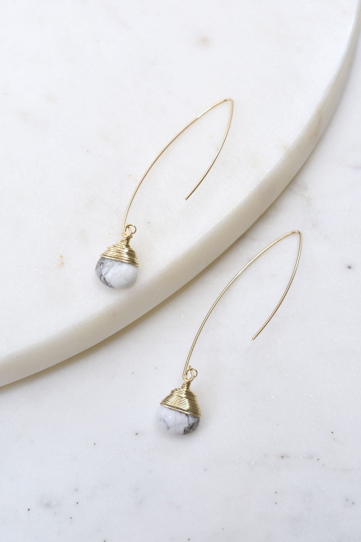 Made with white Mojave copper turquoise, hand-wrapped in vermeil or sterling silver. Earring length: 1 inch. Handmade in Sausalito, California.