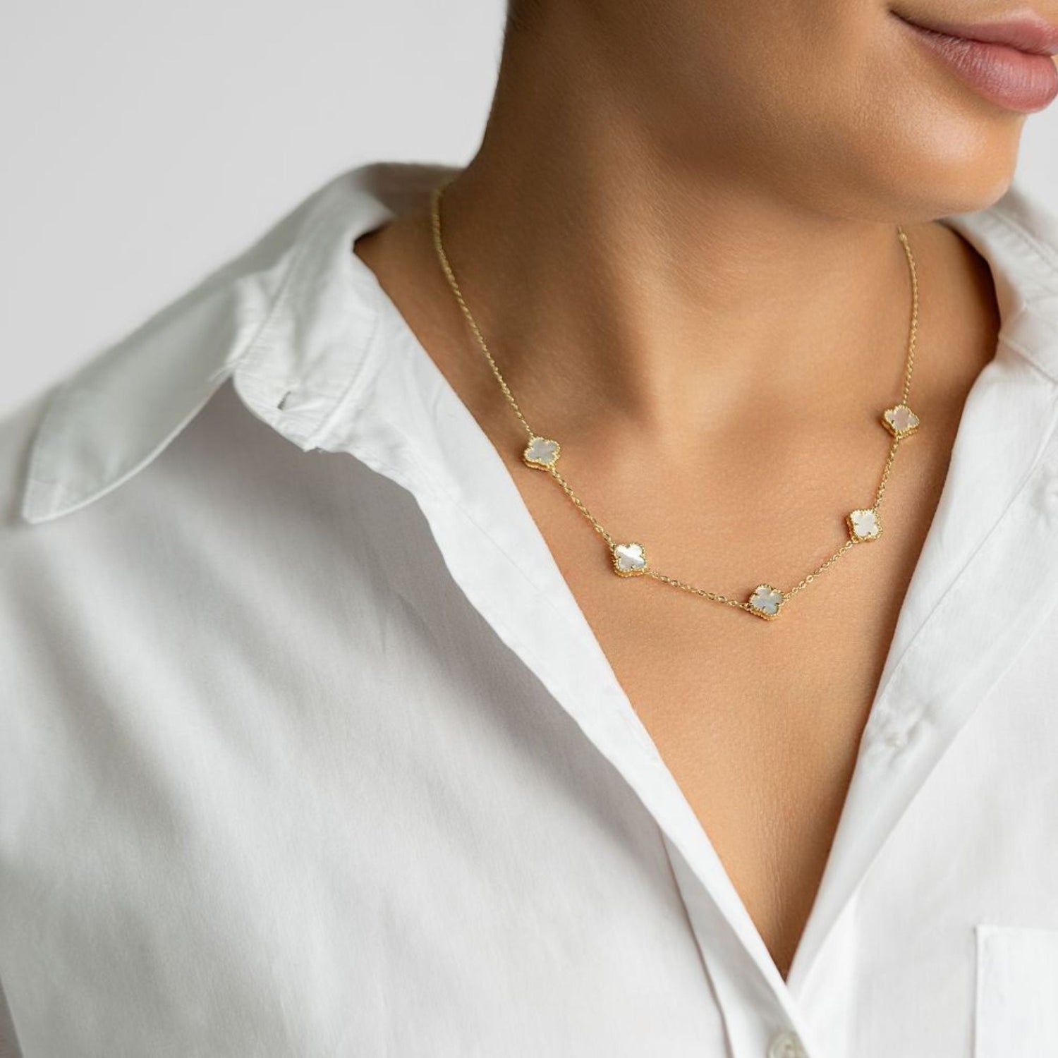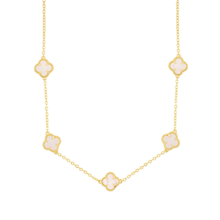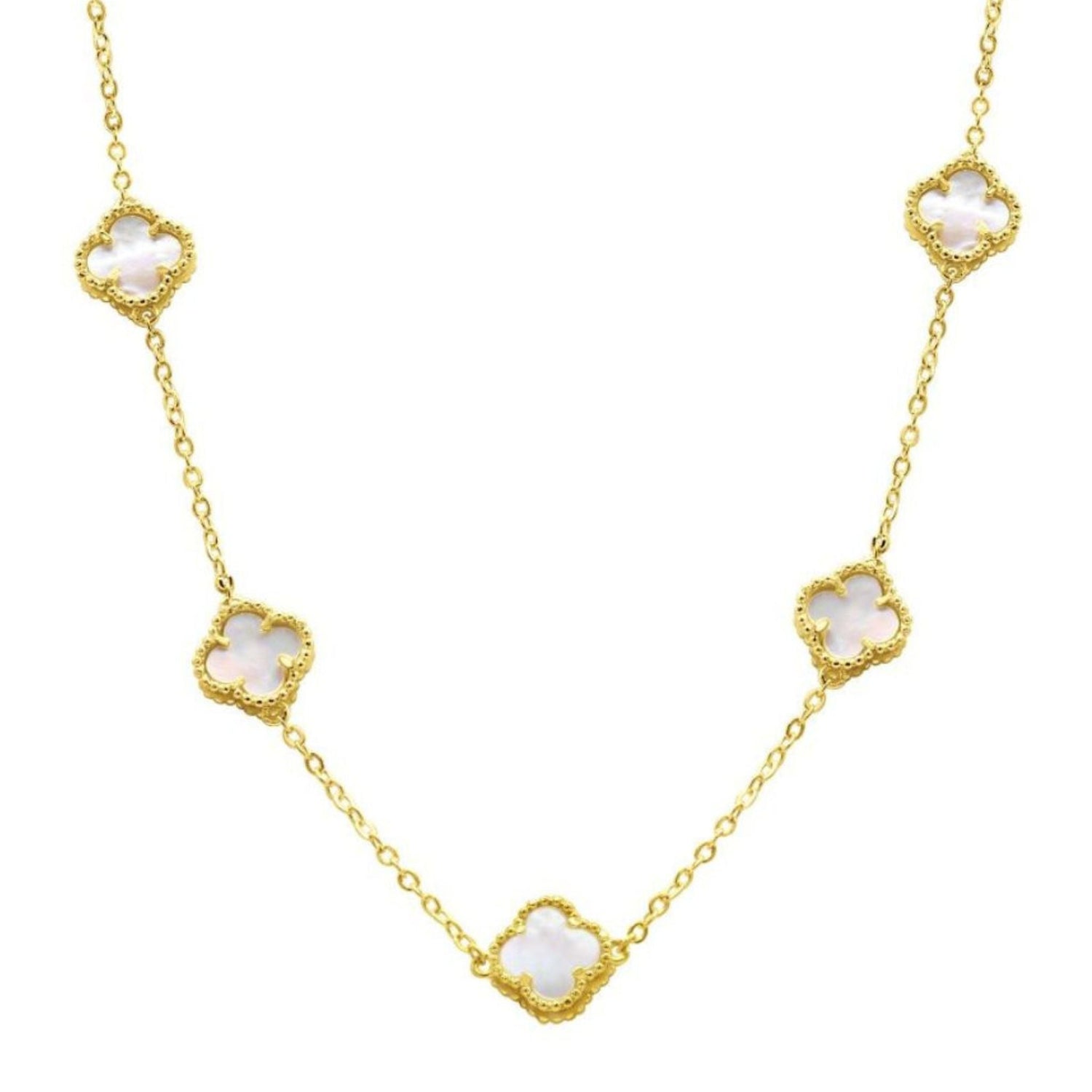 Made from 14K yellow gold-plated brass, featuring white mother of pearl, flower stations 8mm, 16' chain with 2' extender, toggle closure.