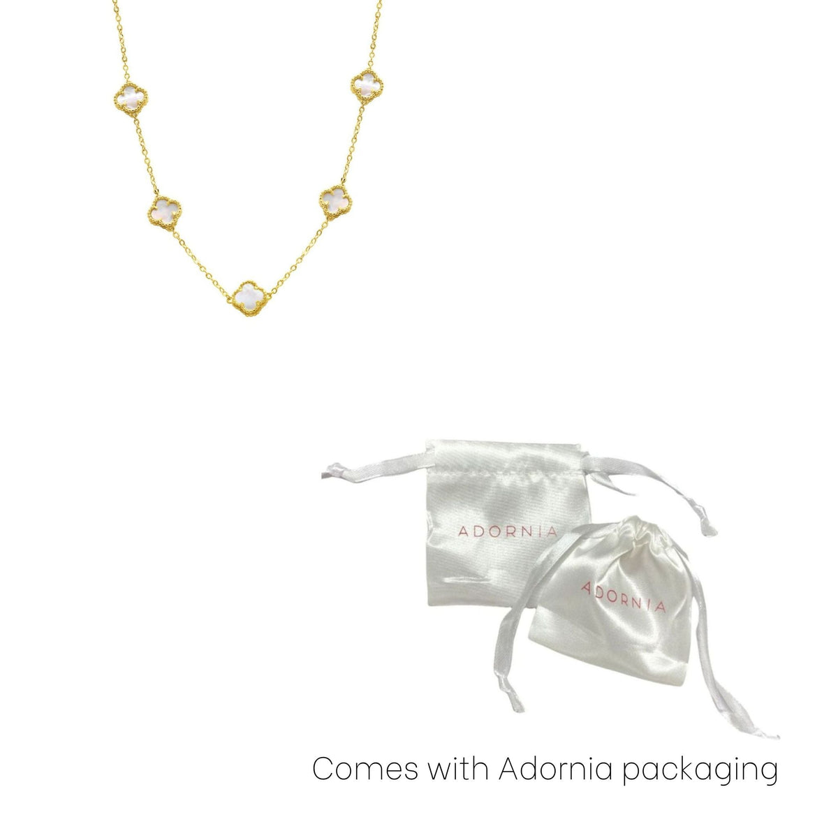 This White Mother of Pearl Flower Station Necklace Gold by Adornia offers a luxurious, trend-forward design. Crafted from 14K yellow gold-plated brass, this necklace features 8mm flower stations, each delicately set with white mother of pearl. The 16' chain, with a 2' adjustable length, ensures a perfect fit for any occasion. The toggle closure adds a modern touch to this classic design.