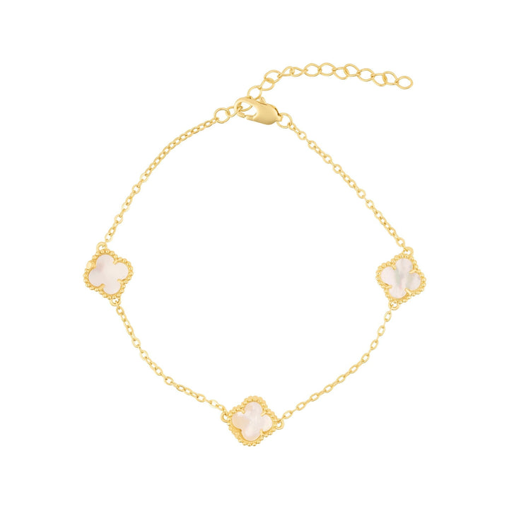14k yellow gold plated brass. White mother of pearl flowers. 6.5' long, adjustable by 1.5'. Lobster closure.