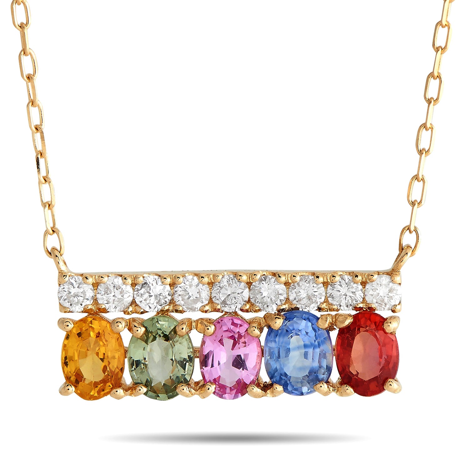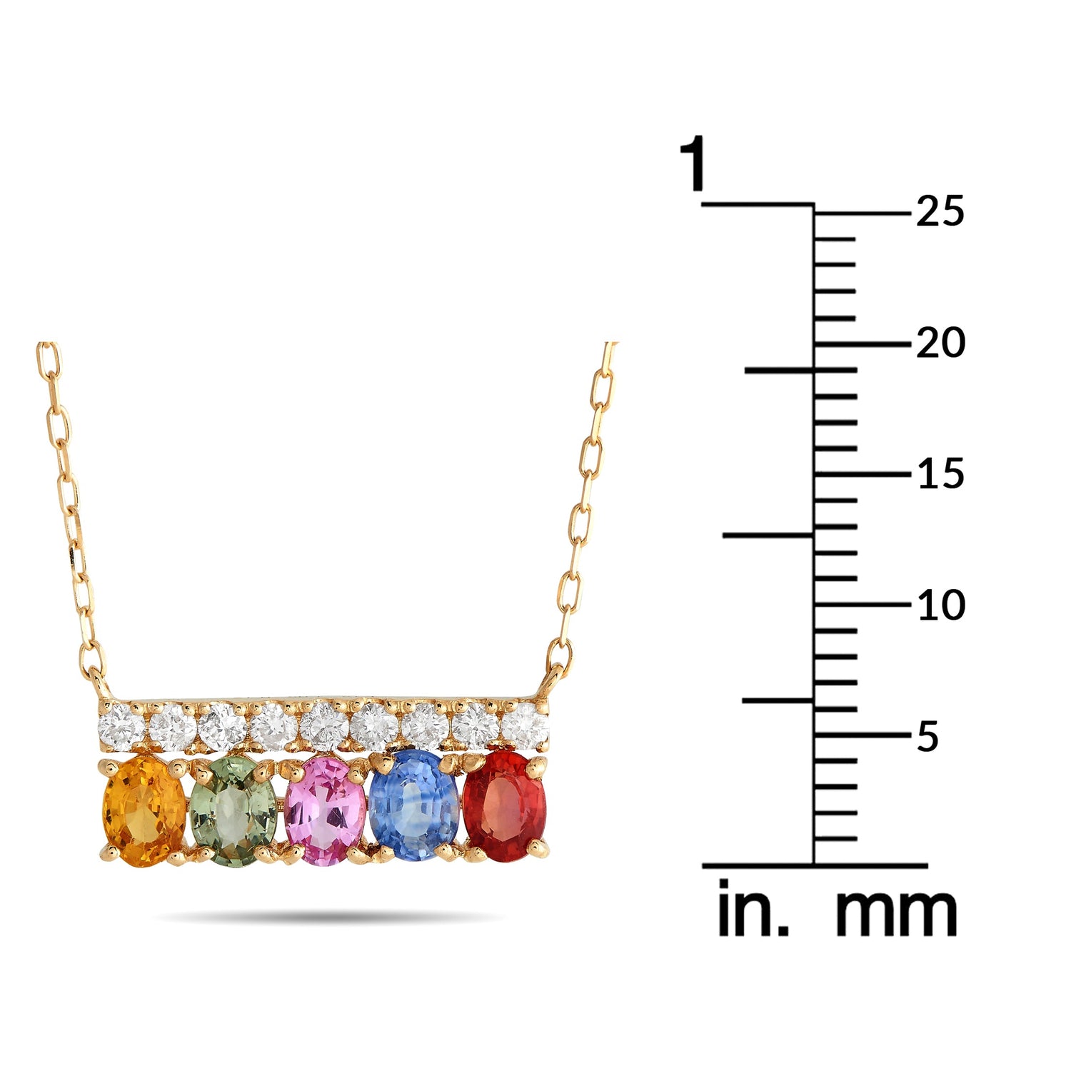 This LB Exclusive 18K Yellow Gold 0.17ct Diamond and Multicolored Sapphire Necklace features a series of sparkling diamonds and vibrant multicolored sapphires, totaling 1.10 carats, creating a stunning visual contrast. The pendant is crafted in 18K yellow gold, with a sleek and sophisticated design. Ideal for adding a touch of color and elegance to your look, this necklace measures 0.25 inches long by 0.65 inches wide and includes a 15-inch chain.