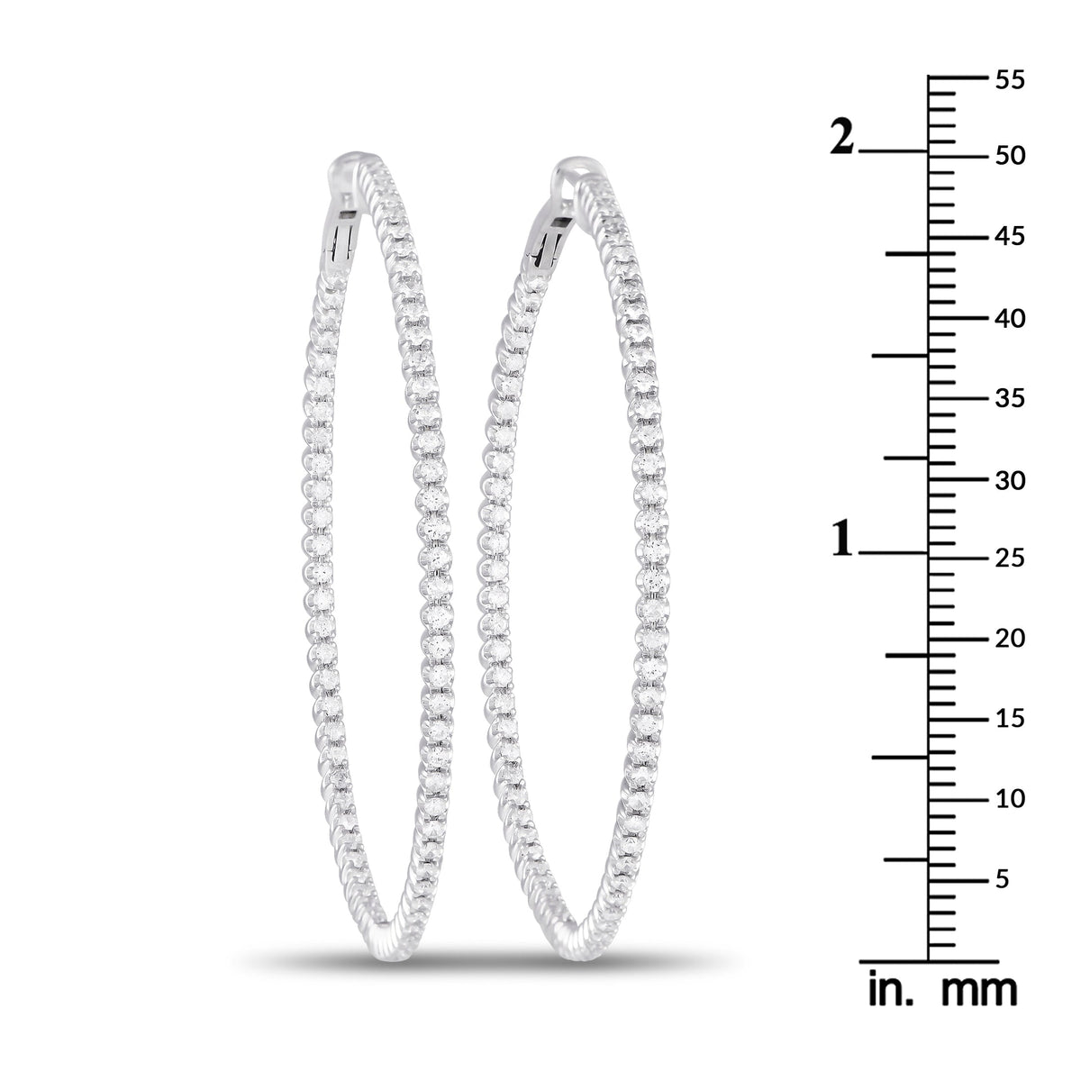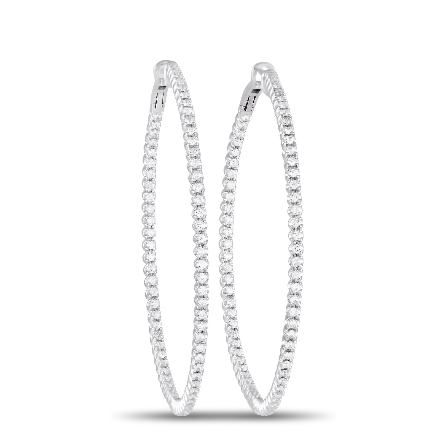 Crafted in 14K white gold with diamonds totaling 1.70 carats. Each hoop measures 2.0' in diameter.