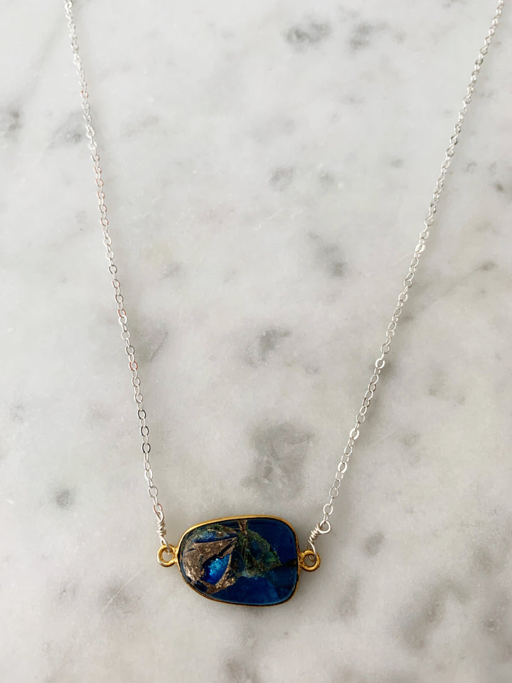 Semi-precious blue Mojave copper turquoise stone. Set in 14k gold vermeil bezel. Sterling silver chain (16' length). Handmade in Sausalito, California.
