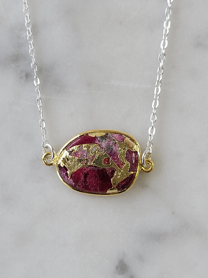 This Mrs. Parker Necklace in Red Mojave Copper Turquoise by A Blonde and Her Bag combines simplicity with elegance. The semi-precious red Mojave copper turquoise stone is set in a 14k gold-fill bezel and suspended on a gold or silver-colored brass chain. Each necklace is unique, with slight variations in the stone due to its individual nature. This necklace is perfect for those who appreciate the beauty of natural stones in a refined, minimalist design.