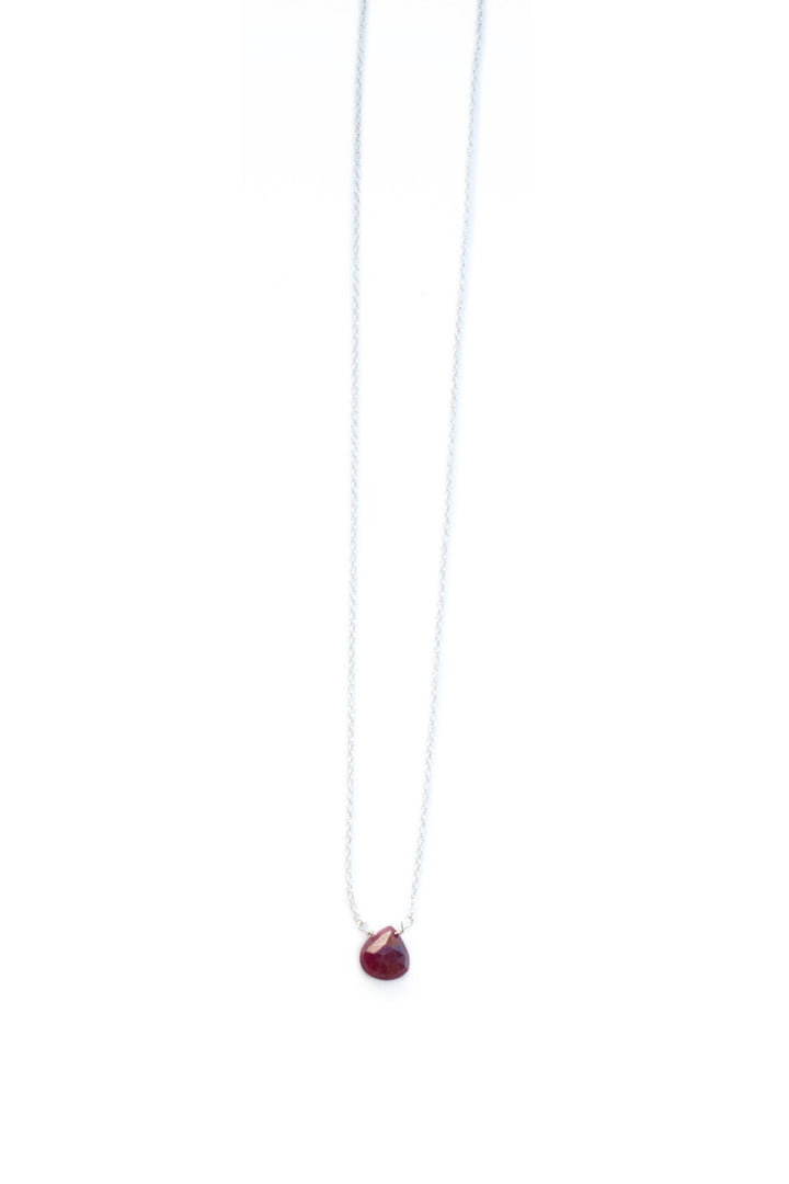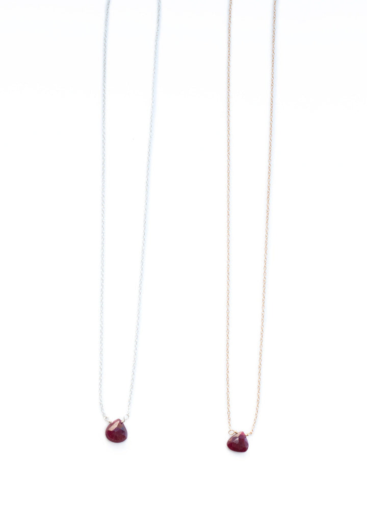 Crafted from metal alloy (silver and copper with high-quality plating). Features a semi-precious ruby pendant. Necklace length: 15' with a drop pendant. Hypoallergenic. Handmade in Sausalito, California.