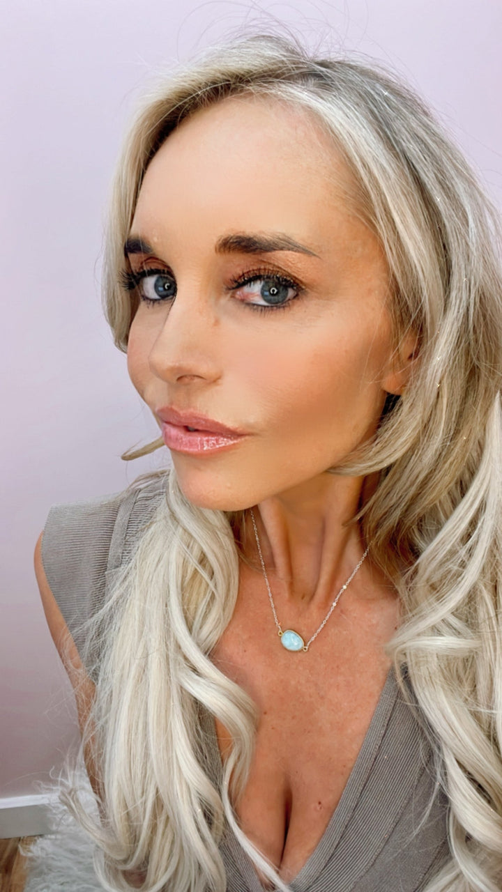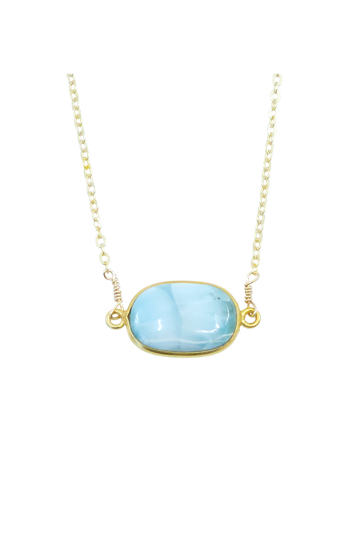 This Mrs. Parker Necklace in Larimar by A Blonde and Her Bag features a semi-precious chalcedony stone set in a 14k gold-filled bezel. The necklace's minimalist design is perfect for those who love delicate yet striking pieces. Available on a gold or silver-colored chain, this piece is a great addition to any jewelry collection. The chalcedony stone's natural beauty is highlighted by the simple, timeless design.