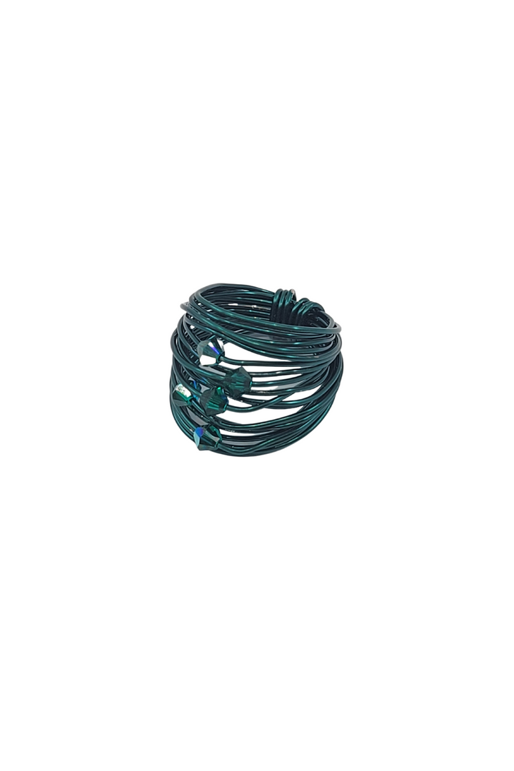 The Green Marcia Ring with Forest Green Swarovski Crystals is an exquisite statement piece. Designed with an abundance of wire, this bold ring features forest green Swarovski crystals. Available in your choice of green over copper wire, it's a striking accessory perfect for making a unique fashion statement.