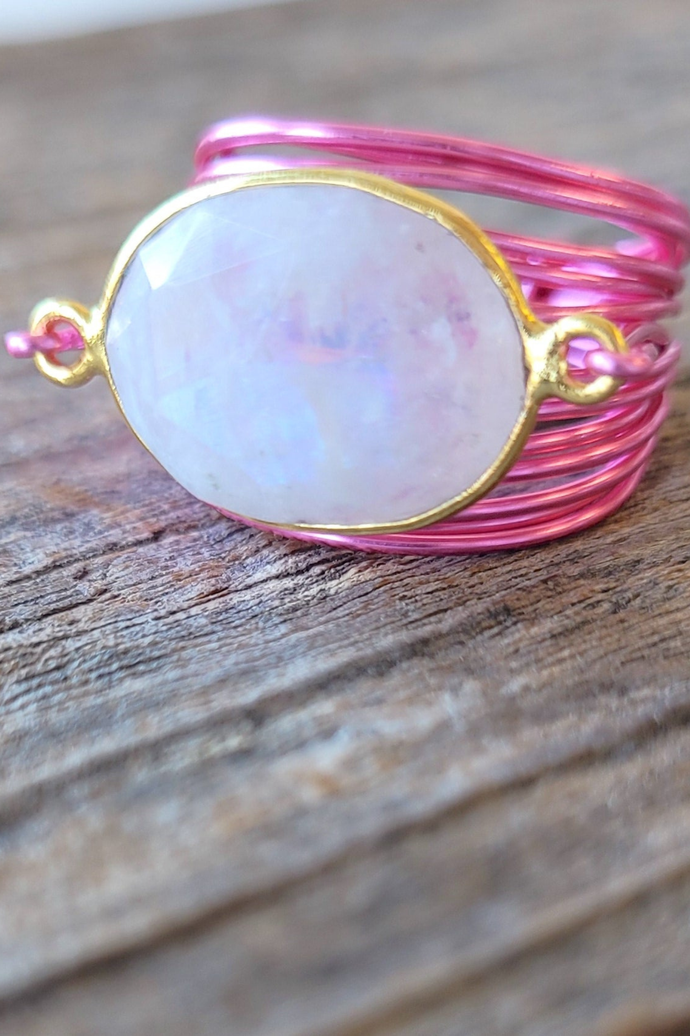Semi-precious moonstone set in a 14k gold bezel. Hot pink over copper wire. Hypoallergenic. Handmade in Sausalito, California. Available in sizes 4–14 (including half sizes).