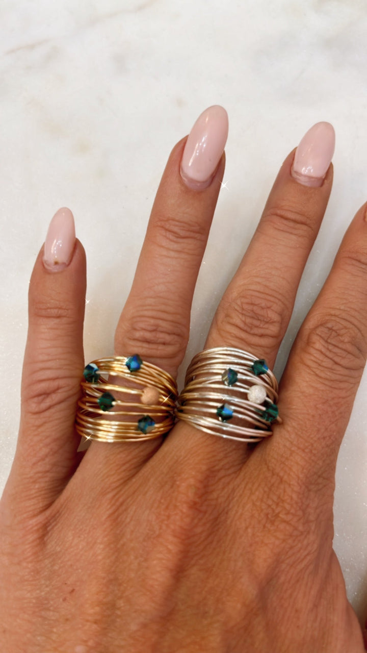 This Marcia Wire Wrap Ring with Deep Green Swarovski Crystals by A Blonde and Her Bag is a bold yet intricate piece designed to make a statement. Inspired by the designer Marcia, this ring features an abundance of meticulously wrapped wire, creating a sculptural effect. The deep green Swarovski crystals bring a sense of mystery and depth, while gold-toned versions are accented with a rose gold stardust bead, and silver-toned variations feature a silver stardust bead. A standout ring that blends craftsmanship with vibrant beauty.