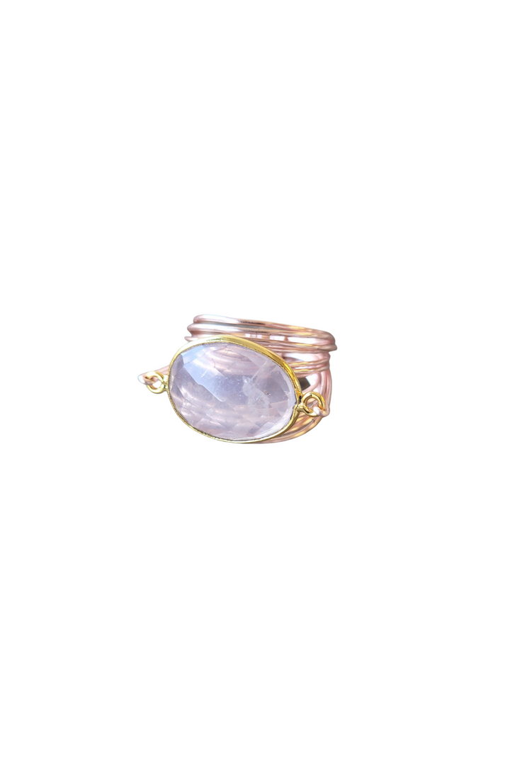 Semi-precious rose quartz set in 14k gold bezel. Rose gold over copper wire. Hypoallergenic. Handmade in Sausalito, California. Available in sizes 4–14 (including half sizes).