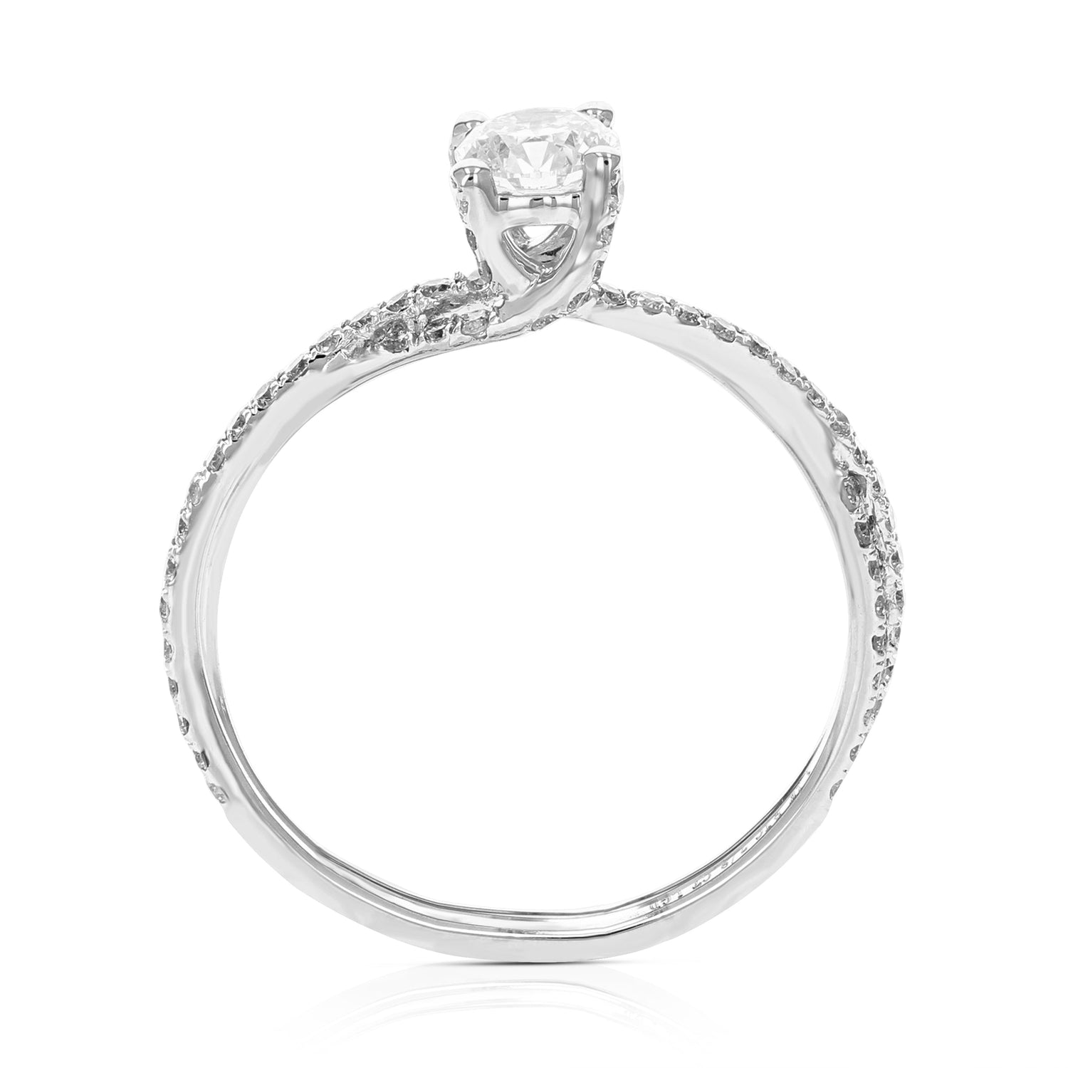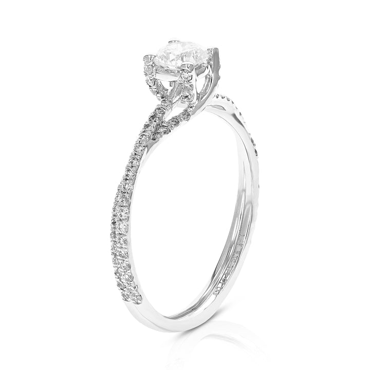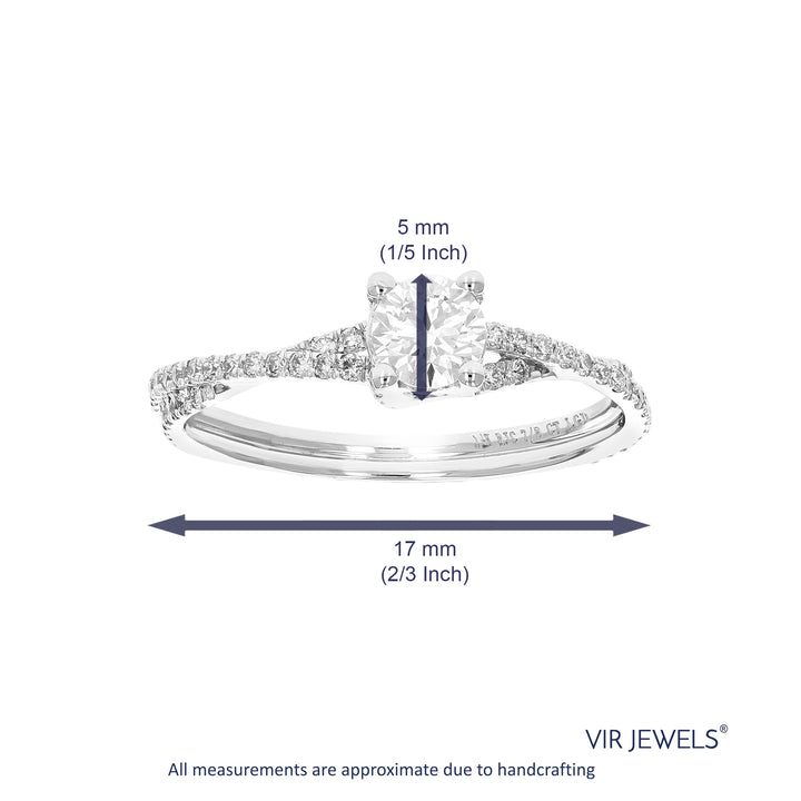 Metal: 14K White Gold, Stone: Lab Grown Diamond, Carat Weight: 7/8 cttw, Diamond Cut: Round, Diamond Color: H-I, Diamond Clarity: SI1-SI2, Setting: Prong, Number of Diamonds: 79, Engagement Ring Width: 5 mm (1/5 inch).