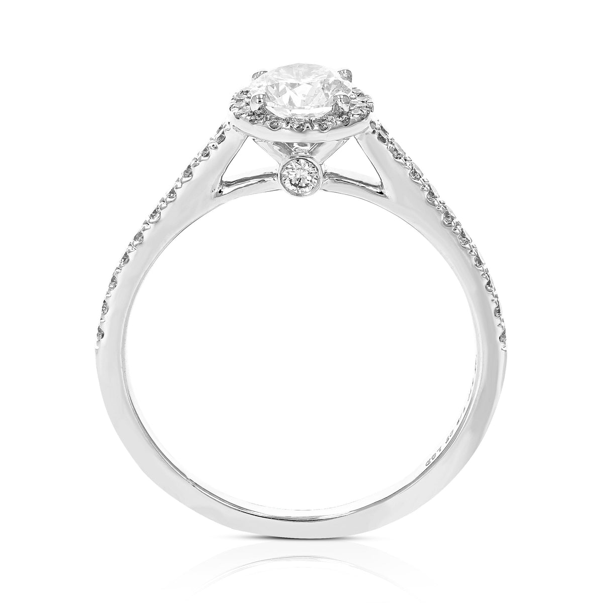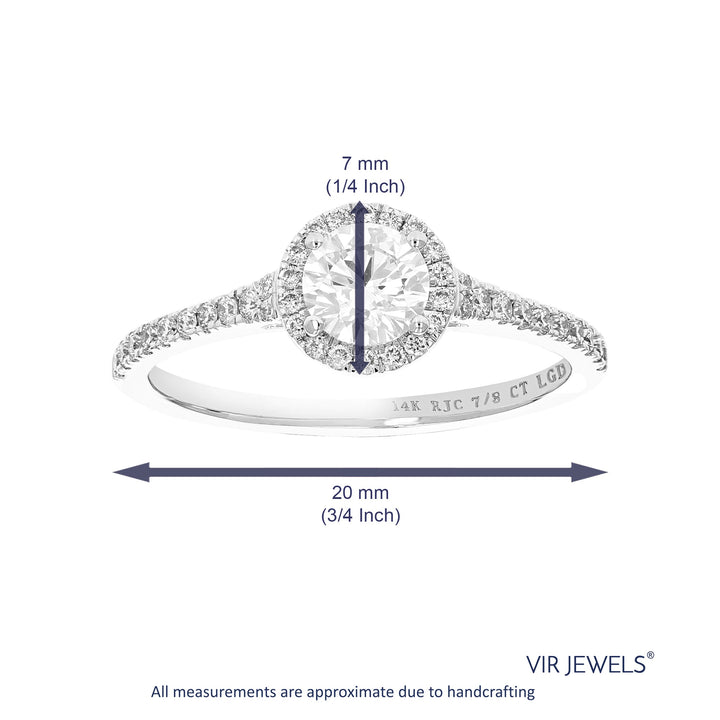 Metal: 14K White Gold, Stone: Lab Grown Diamond, Carat Weight: 7/8 cttw, Diamond Cut: Round, Diamond Color: H-I, Diamond Clarity: SI1-SI2, Setting: Prong, Number of Diamonds: 43, Engagement Ring Width: 7 mm (1/4 inch).