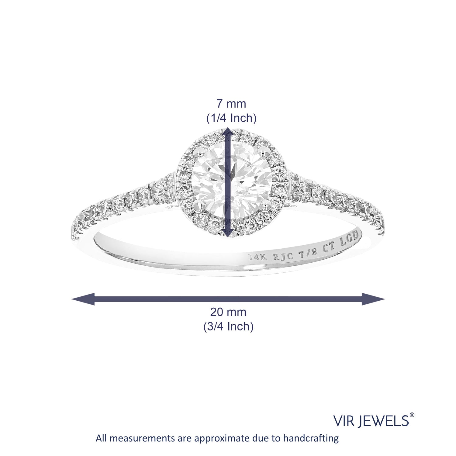 The 7/8 cttw Round Lab Grown Diamond Engagement Ring by Vir Jewels features 43 diamonds, set in a stunning prong setting on a durable 14K white gold band. With a width of 1/4 inch, this ring is designed to make a bold yet elegant statement. The round diamonds, which offer the same brilliance and durability as natural diamonds, are perfect for a responsible choice that doesn't compromise on luxury. Ideal for marking life’s most important moments, this ring blends timeless style with sustainability.