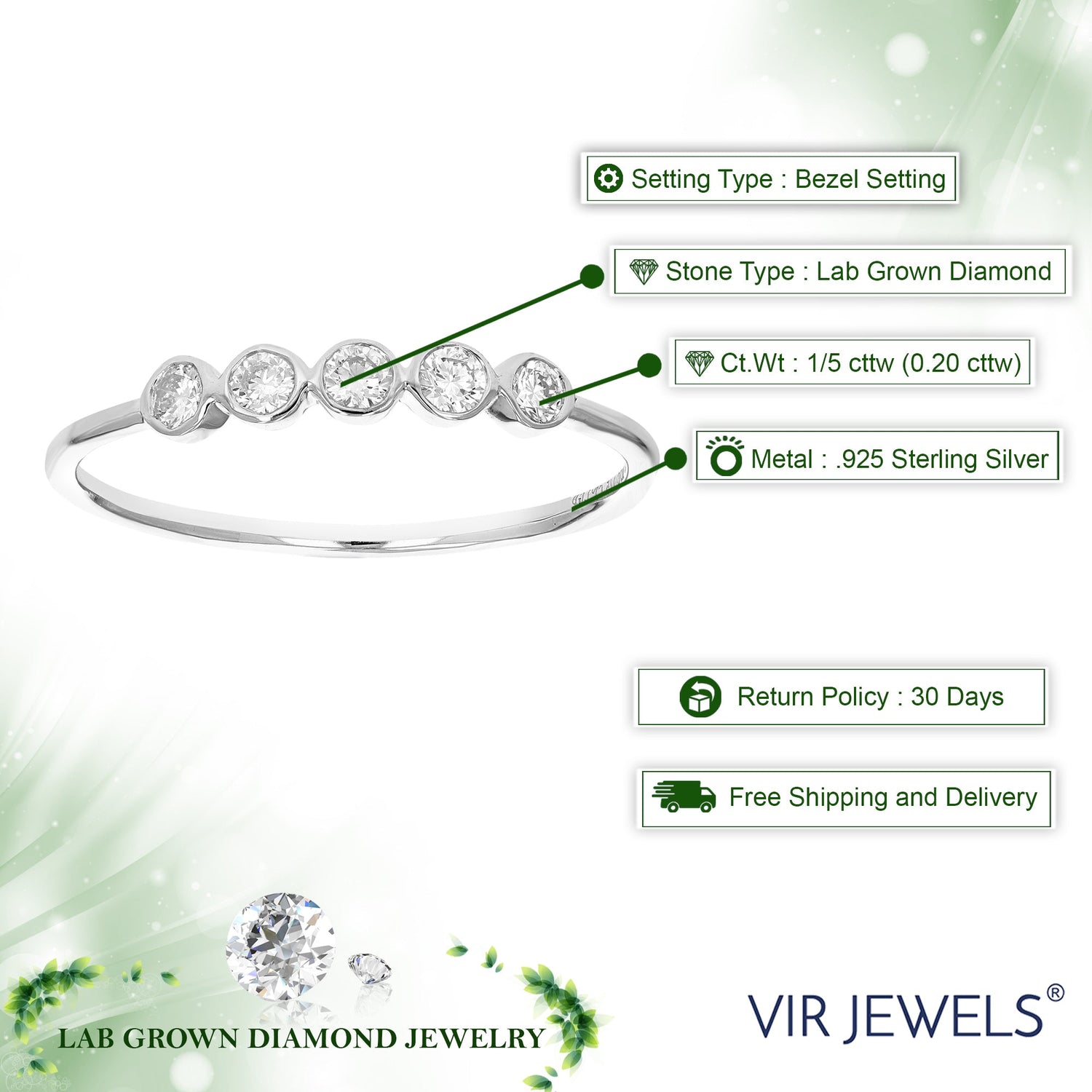This 1/5 cttw Lab Grown Diamond Engagement Ring by Vir Jewels combines classic beauty with modern innovation. Featuring 5 diamonds set in a bezel setting, the diamonds are securely held and their brilliance enhanced. Crafted in .925 sterling silver, this ring is as durable as it is beautiful. With its timeless design, this engagement ring is perfect for someone who values both luxury and sustainability.