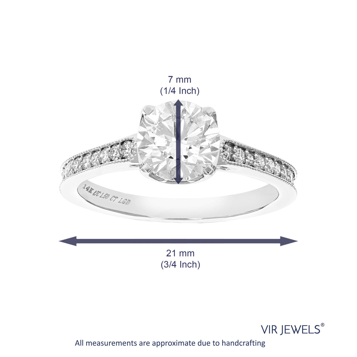 This 1.50 cttw Lab Grown Diamond Engagement Ring by Vir Jewels is an elegant and timeless piece, crafted to symbolize eternal love. The round prong-set diamonds, with VS2-SI1 clarity and H-I color, create a brilliant sparkle that catches the eye. The 14K white gold band exudes sophistication and complements the 19 lab-grown diamonds beautifully. Ideal for couples seeking a classic engagement ring that radiates luxury and grace.