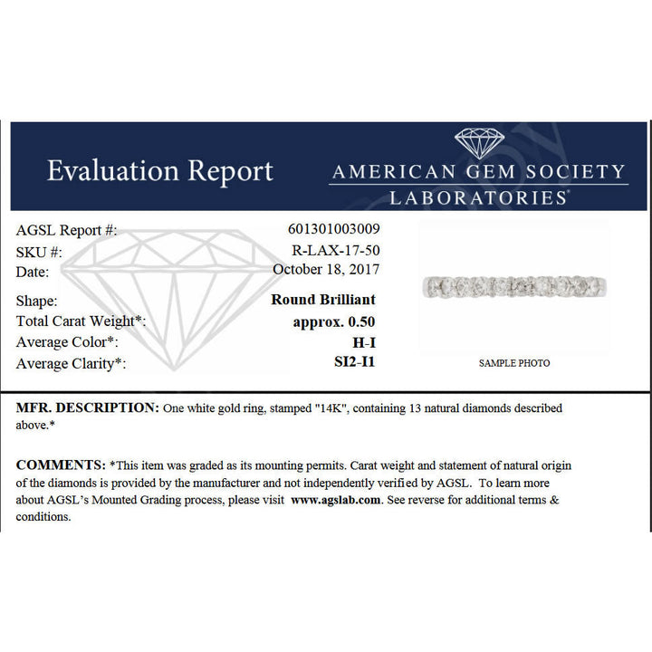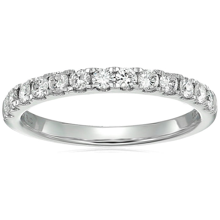 This 1/2 cttw Diamond Wedding Band for women is made of 14K white gold and features 13 round-cut natural diamonds. The diamonds, with SI2-I1 clarity and I-J color, are prong set for a sparkling finish. A certified, elegant choice for any bride-to-be.