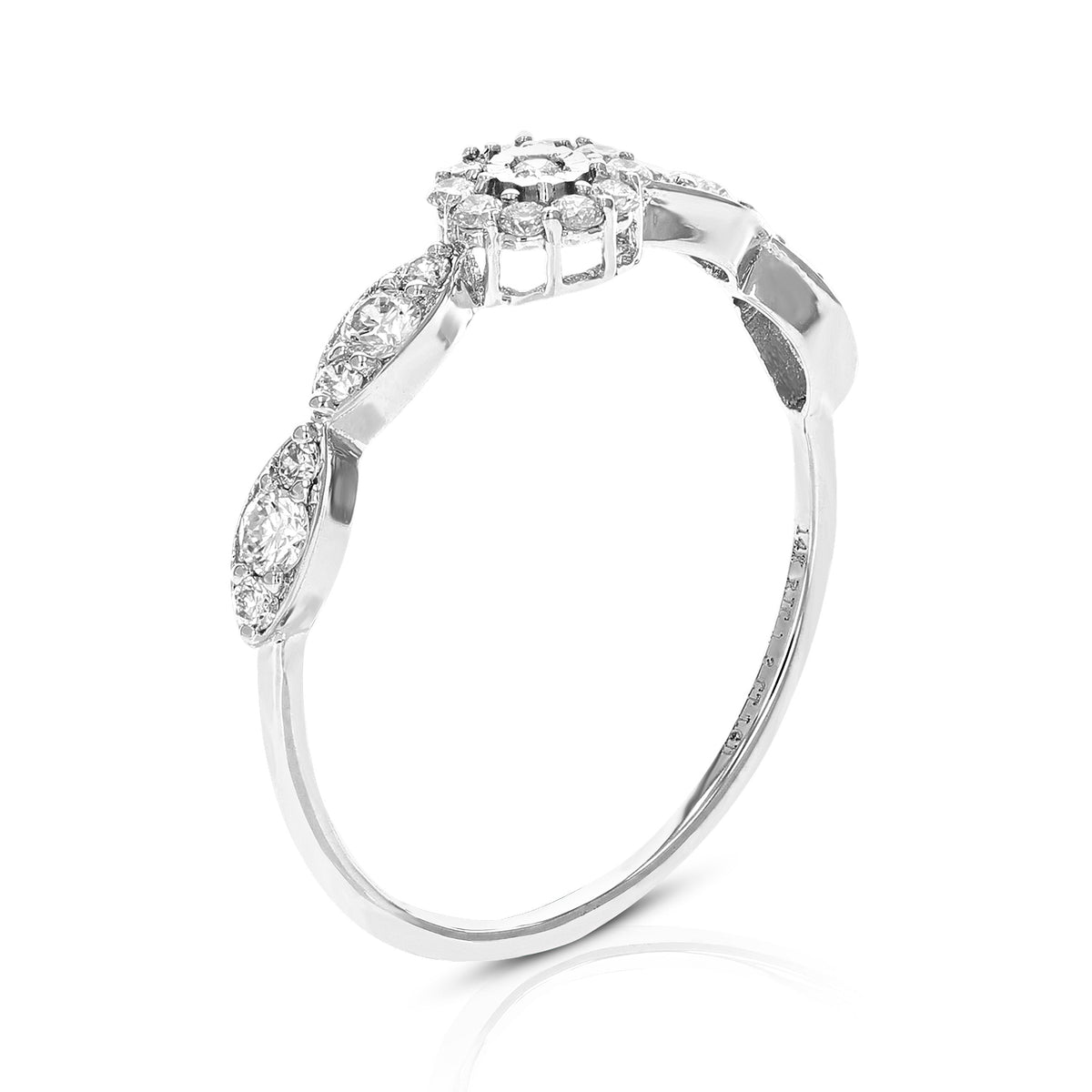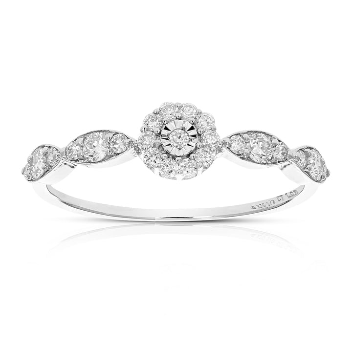 14K white gold, lab-grown diamonds, prong setting. Diamond Carat Weight: 1/3 cttw. Diamond Cut: Round. Diamond Color: H-I. Diamond Clarity: SI1-SI2. Number of Diamonds: 23. Ring Width: 5 MM (1/5 Inch).